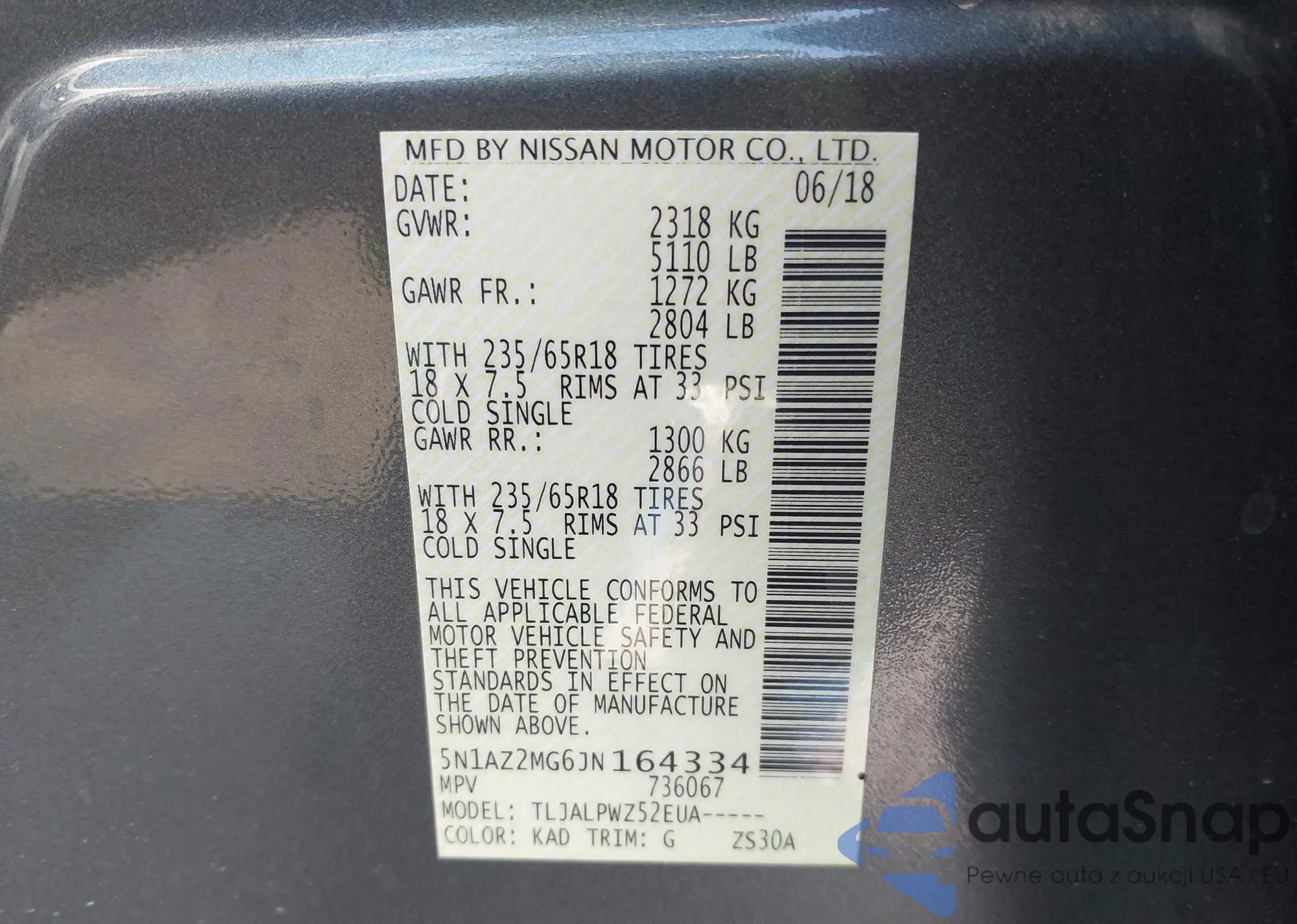 LOT: 44374422 VIN: 5N1AZ2MG6JN164334