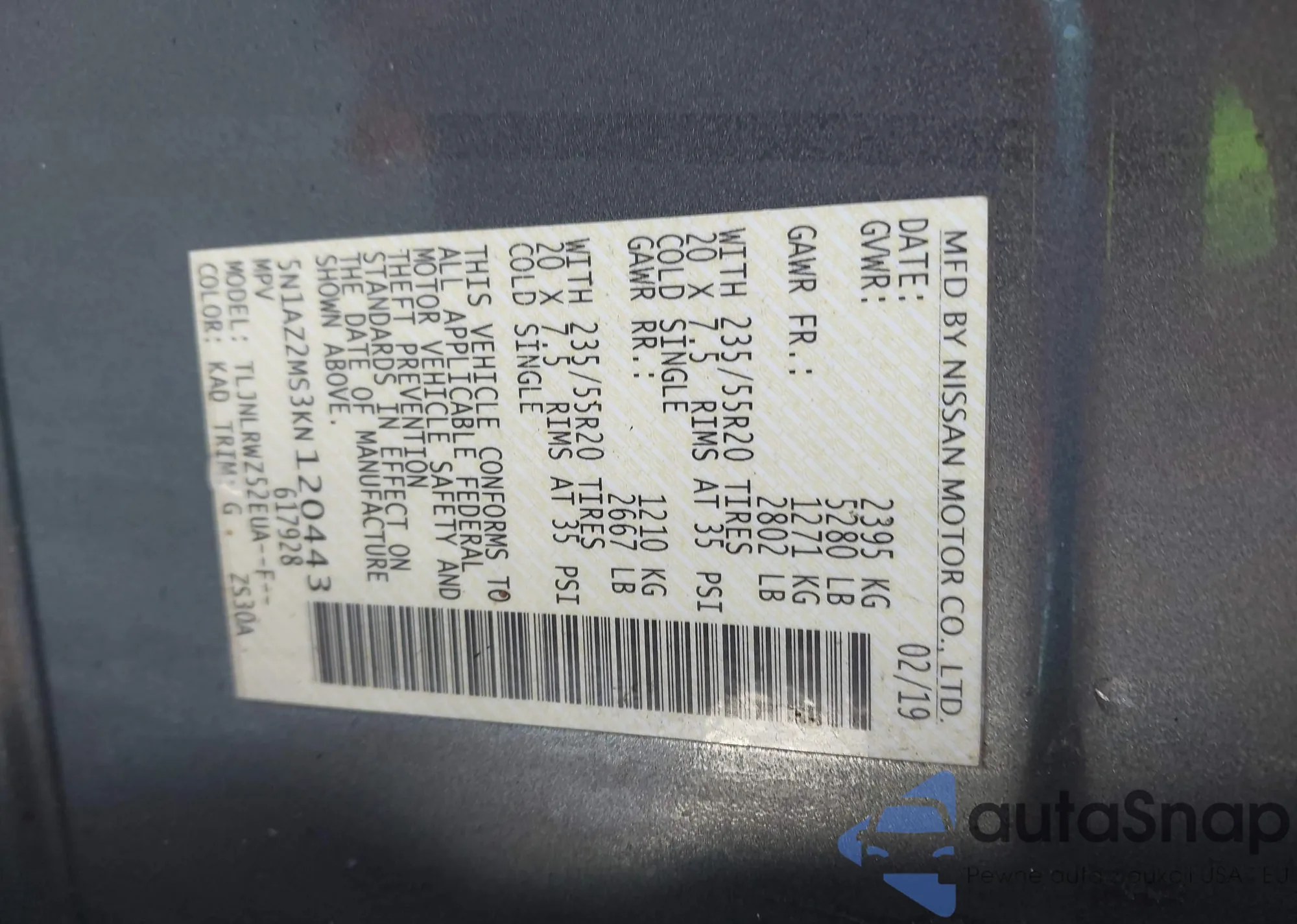• VIN 5N1AZ2MS3KN120443