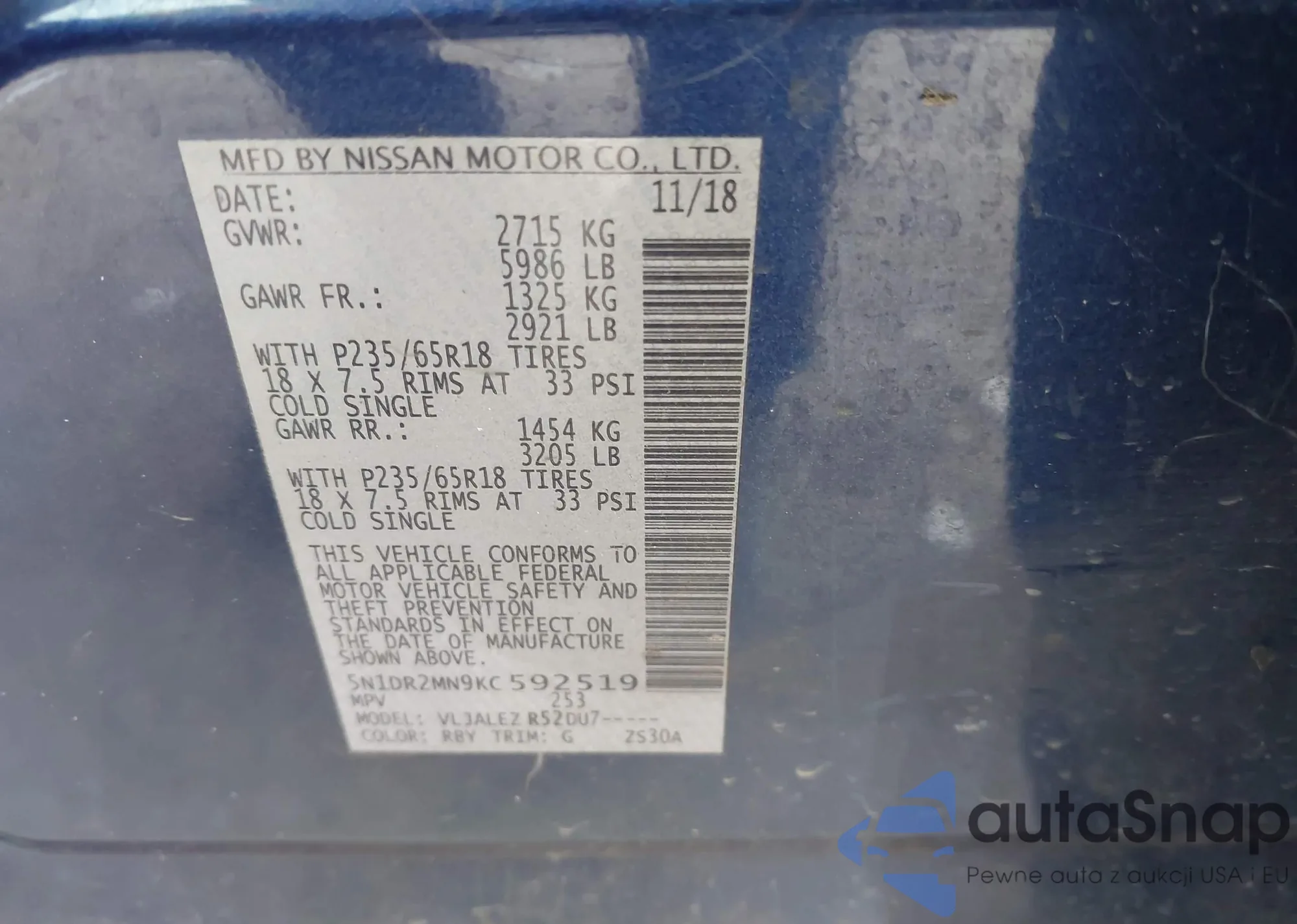 LOT: 44273983 VIN: 5N1DR2MN9KC592519