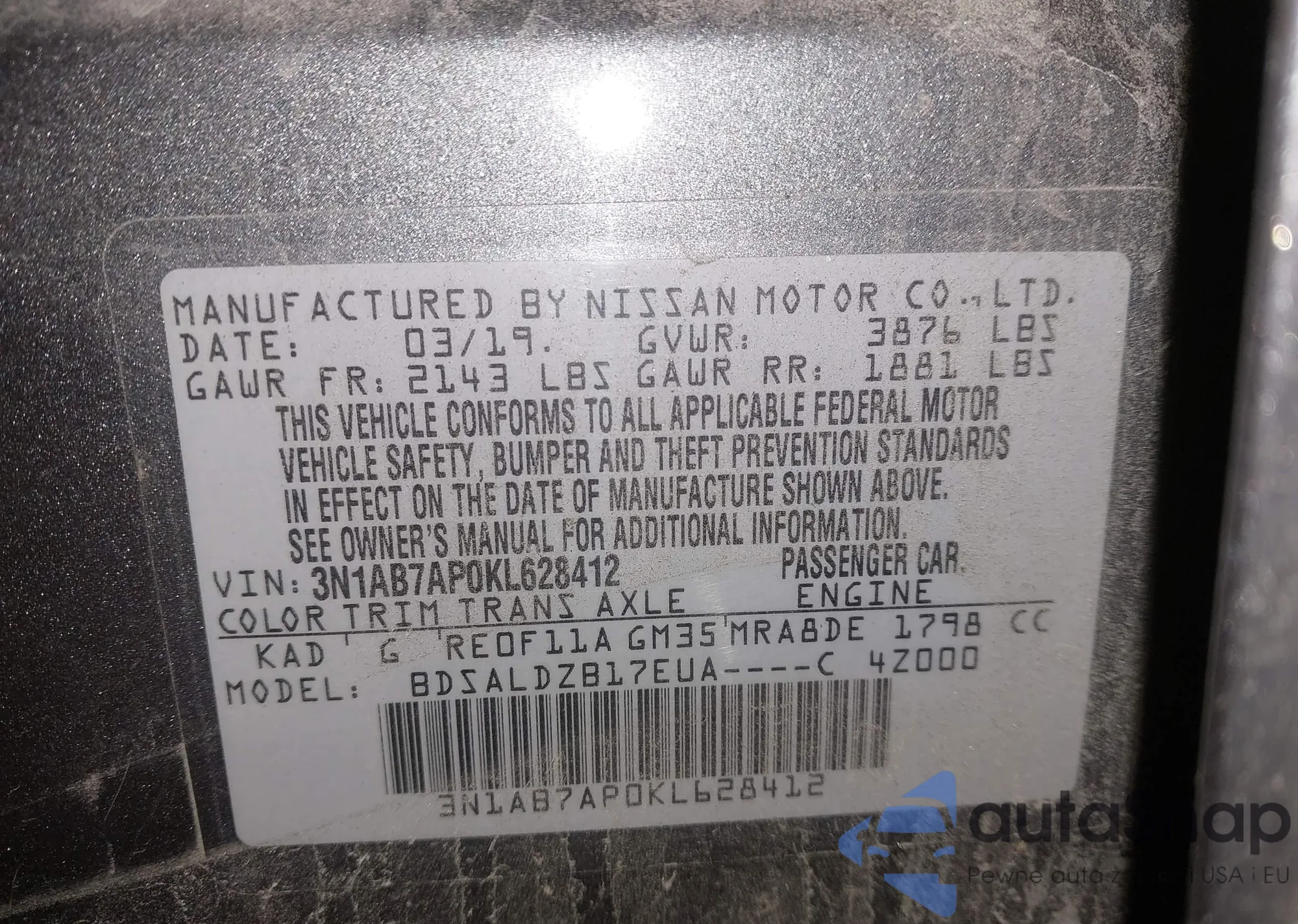 • VIN 3N1AB7AP0KL628412