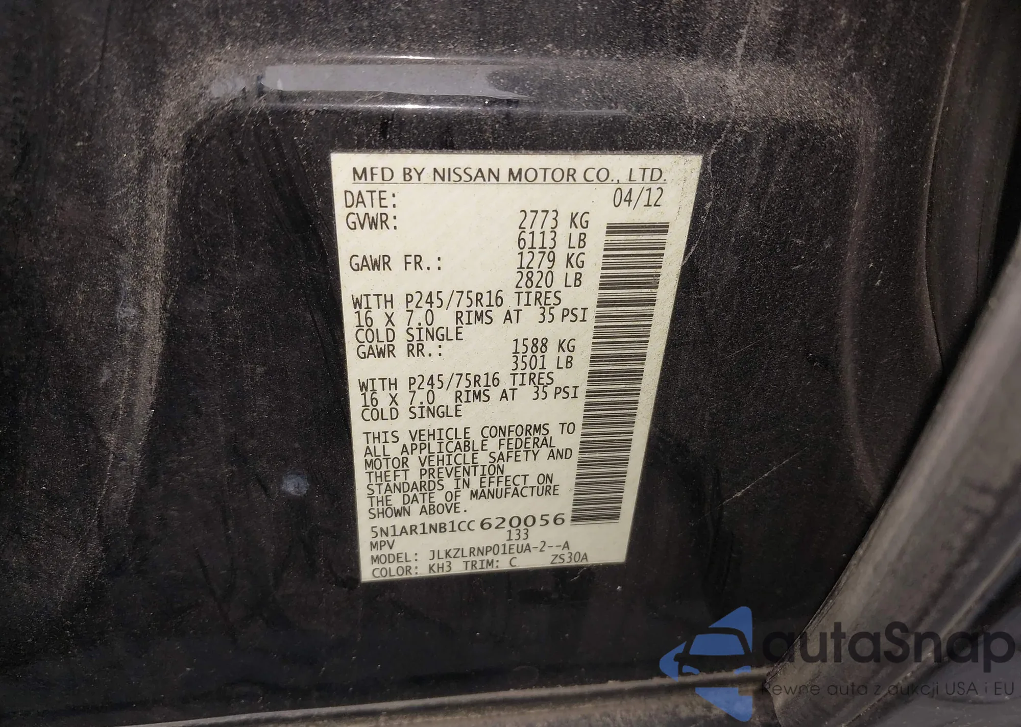 • VIN 5N1AR1NB1CC620056