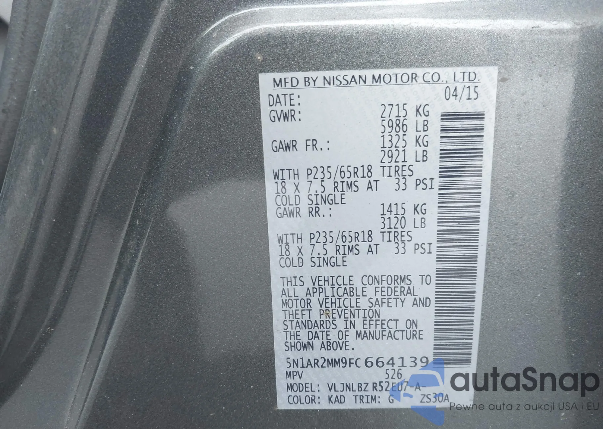 LOT: 44442308 VIN: 5N1AR2MM9FC664139