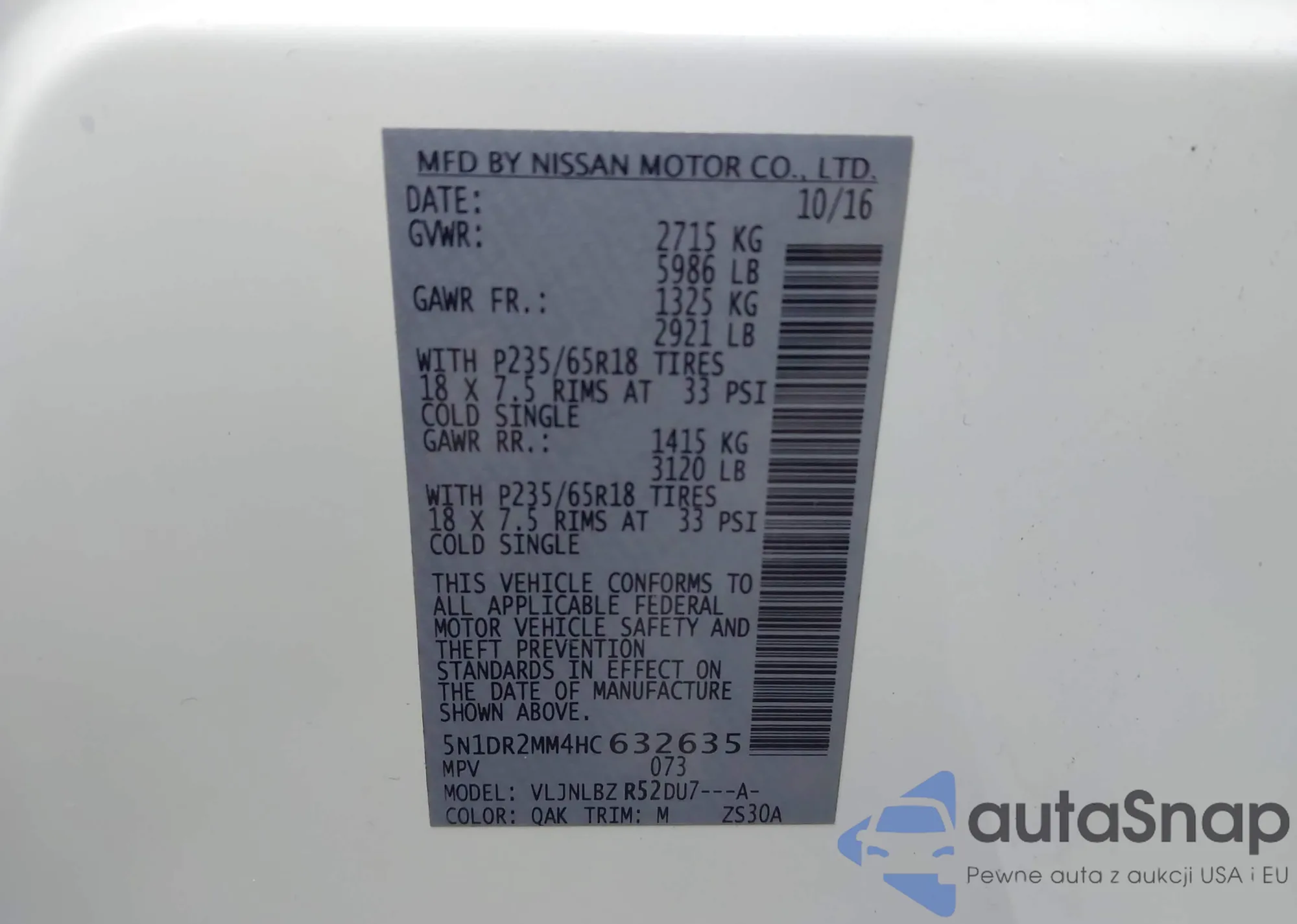 LOT: 44289101 VIN: 5N1DR2MN8JC674725