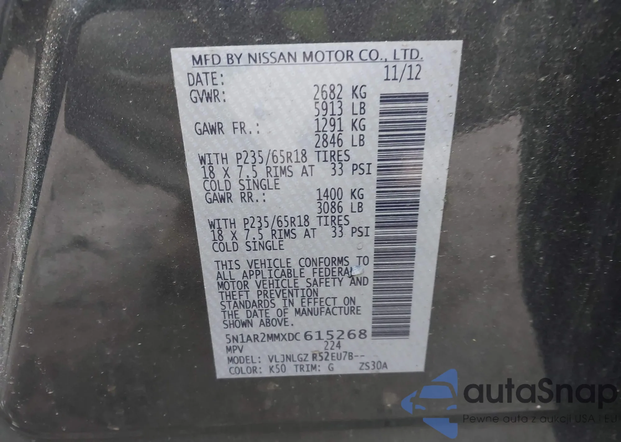 LOT: 44371034 VIN: 5N1AR2MMXDC615268