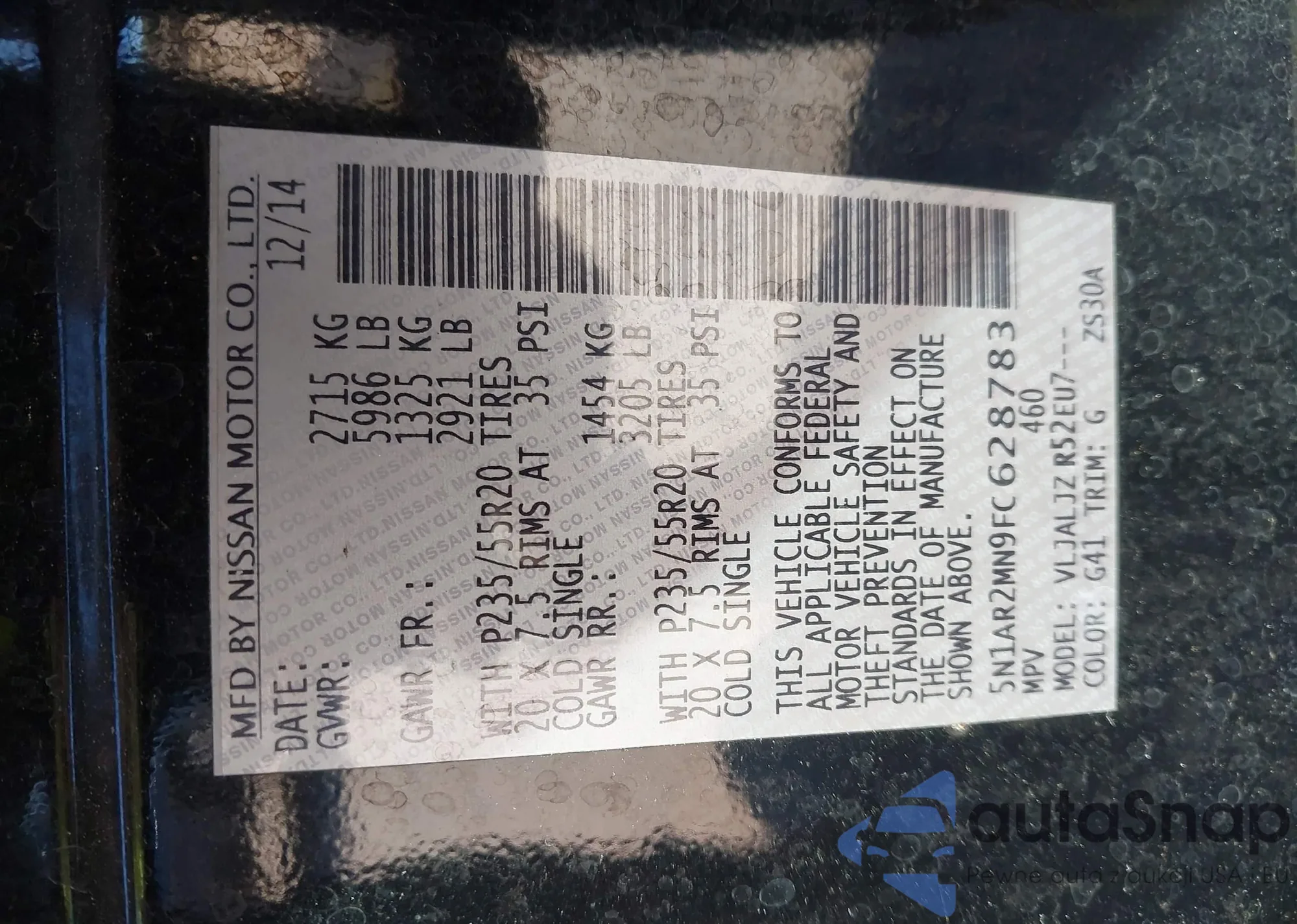 LOT: 44335425 VIN: 5N1AR2MN9FC628783