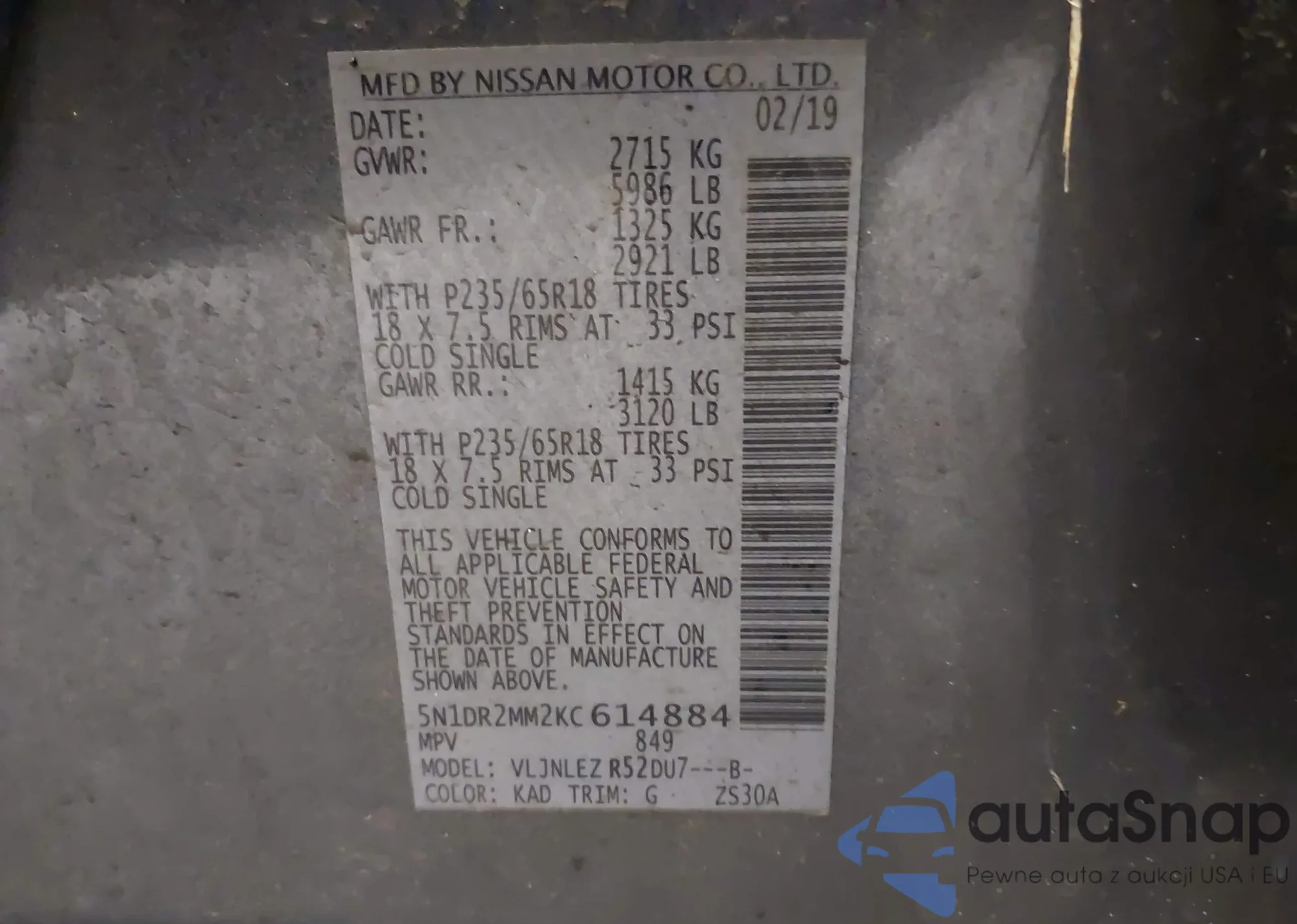 LOT: 44076965 VIN: 5N1DR2MM2KC614884