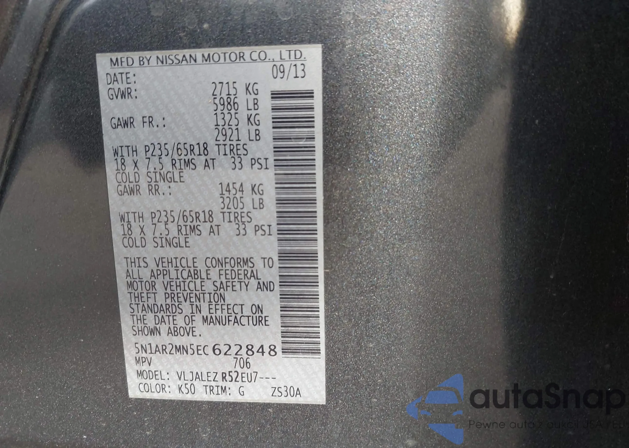 LOT: 44405827 VIN: 5N1AR2MN5EC622848