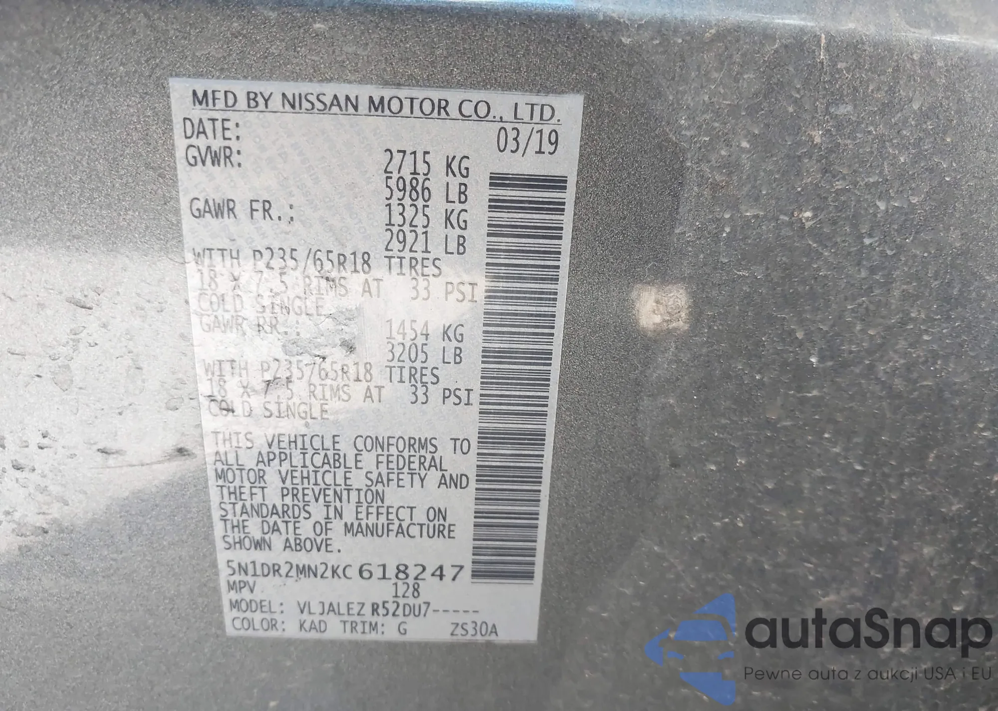 LOT: 44417004 VIN: 5N1DR2MN2KC618247