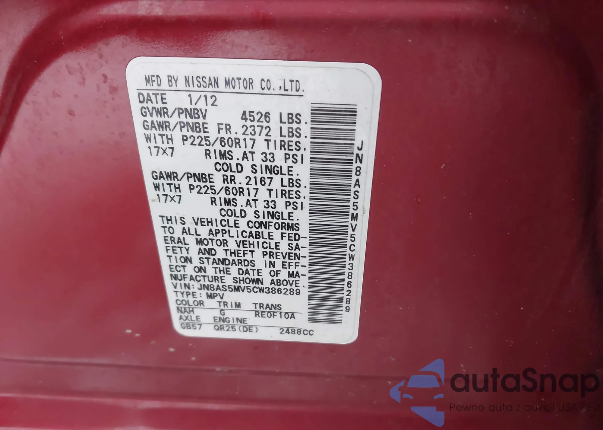 LOT: 44342967 VIN: JN8AS5MV5CW386289