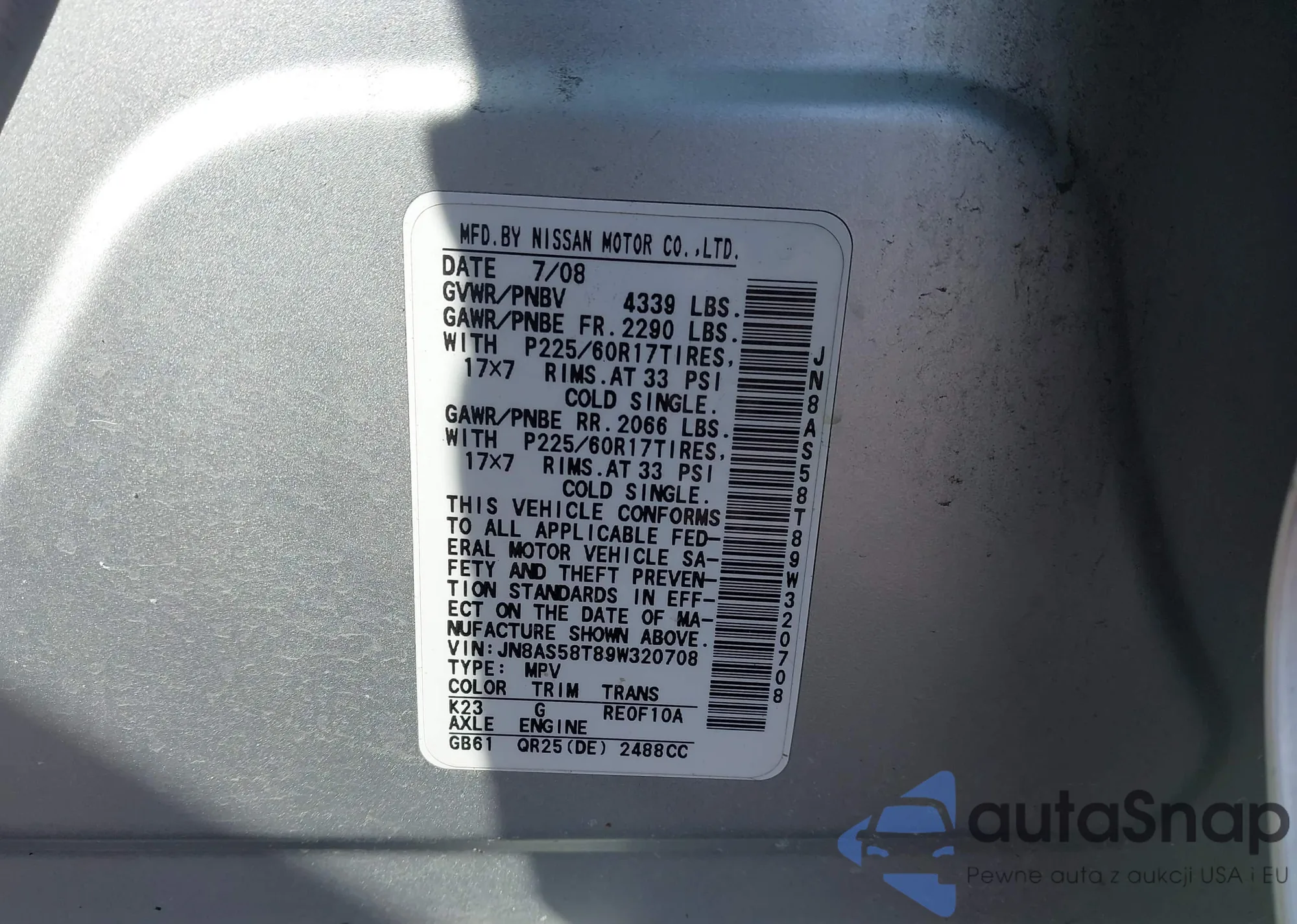 • VIN JN8AS58T89W320708