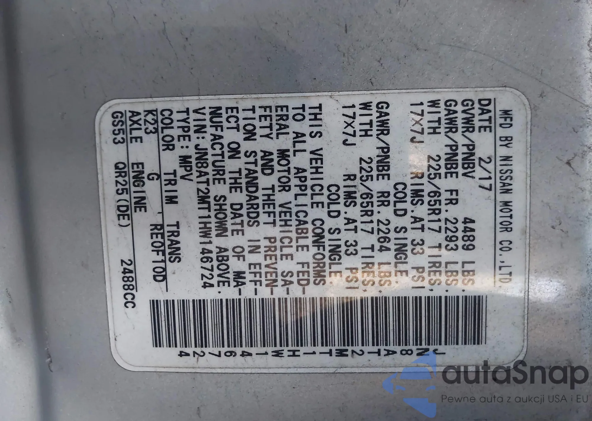 LOT: 44247081 VIN: JN8AT2MT1HW146724