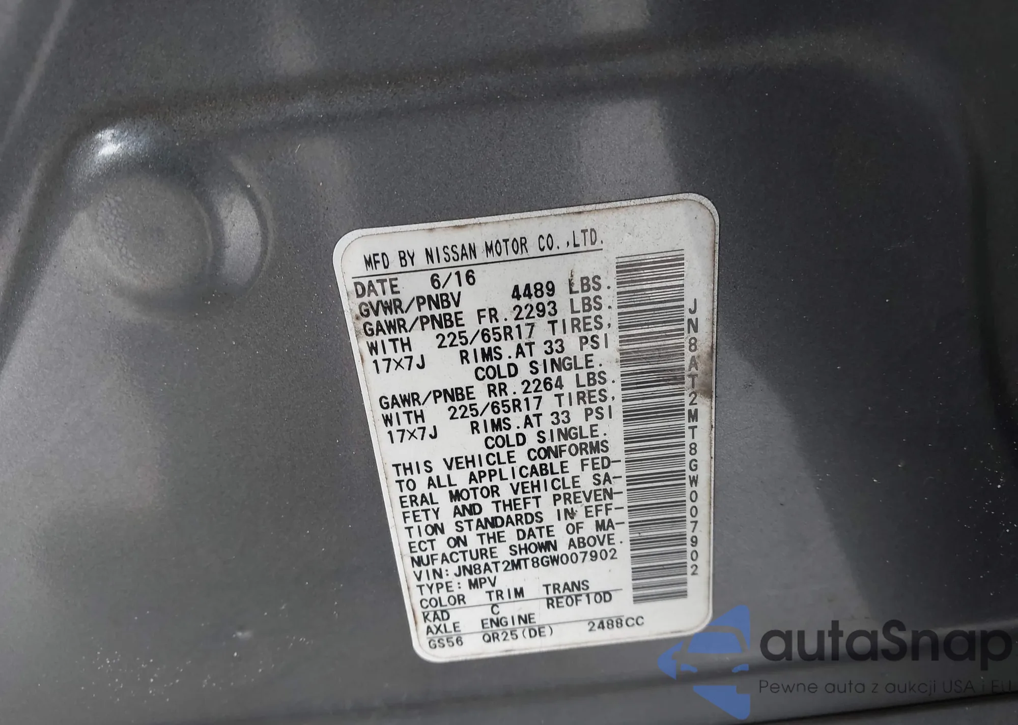LOT: 44167885 VIN: JN8AT2MT8GW007902