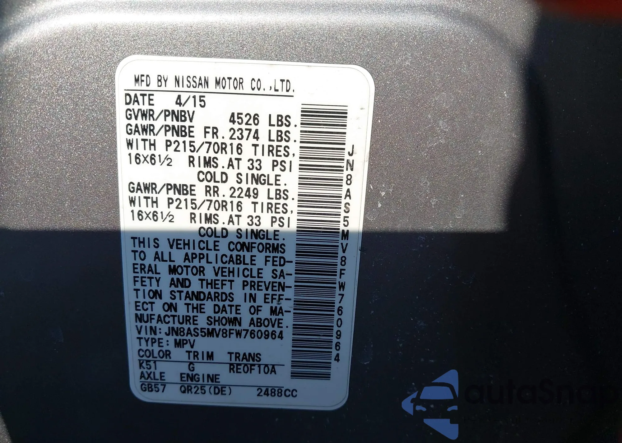 • VIN JN8AS5MV8FW760964