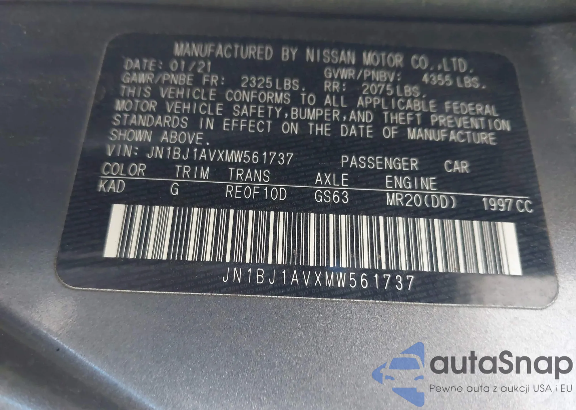 LOT: 43950134 VIN: JN1BJ1AVXMW561737