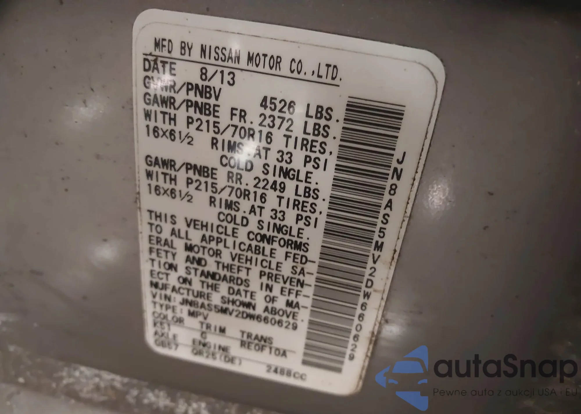 LOT: 44305200 VIN: JN8AS5MV7DW658732