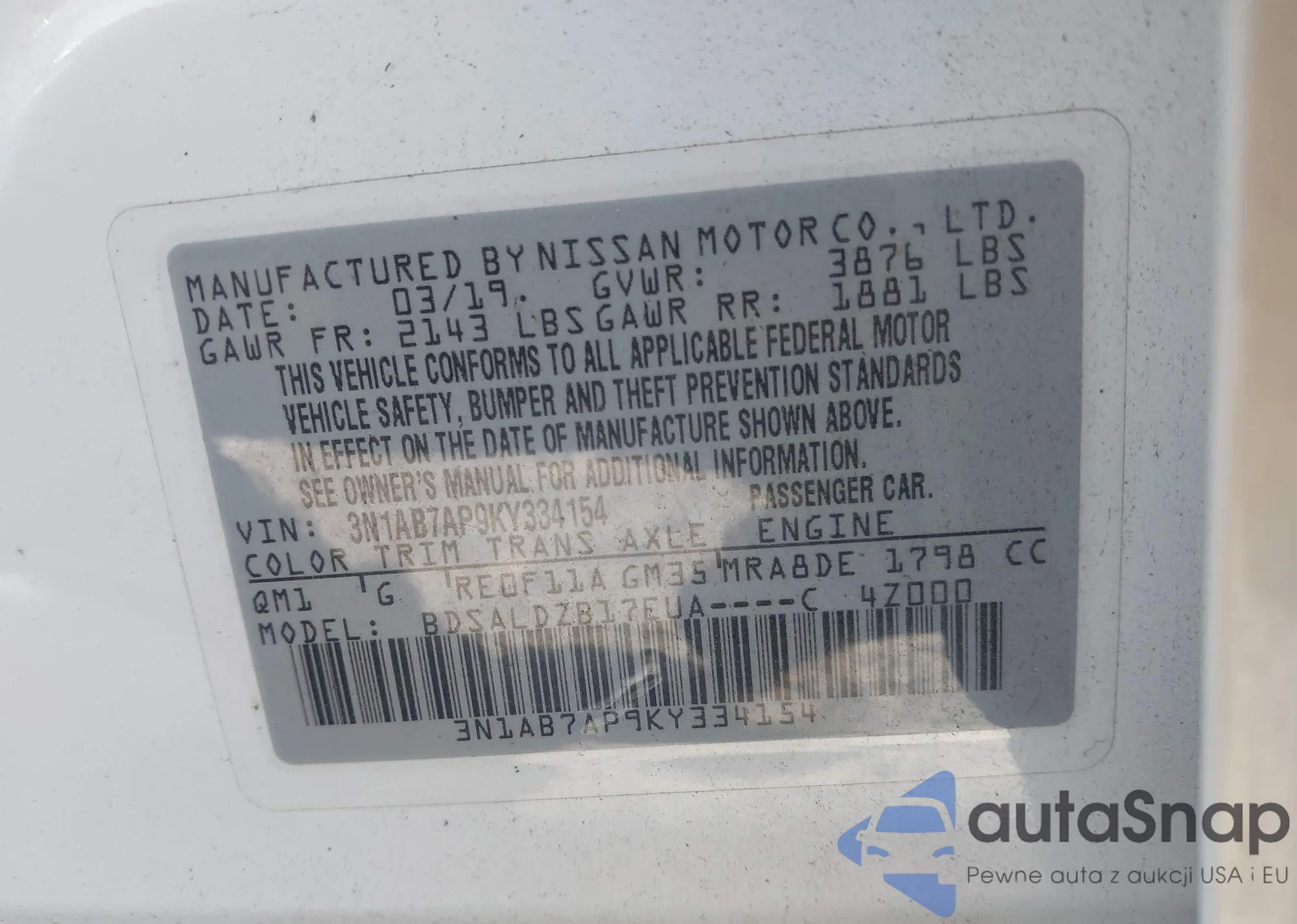 LOT: 44121281 VIN: 3N1AB7AP9KY334154