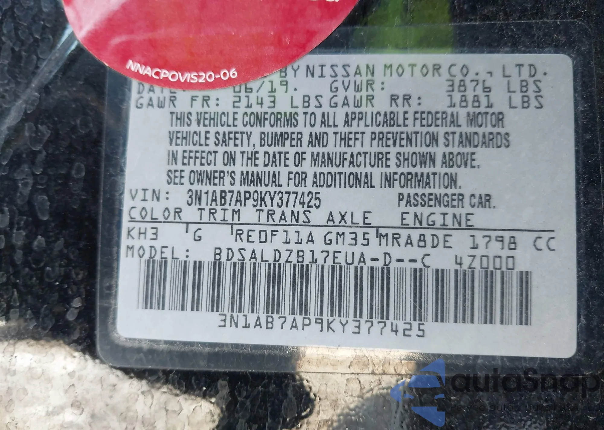 • VIN 3N1AB7AP9KY377425