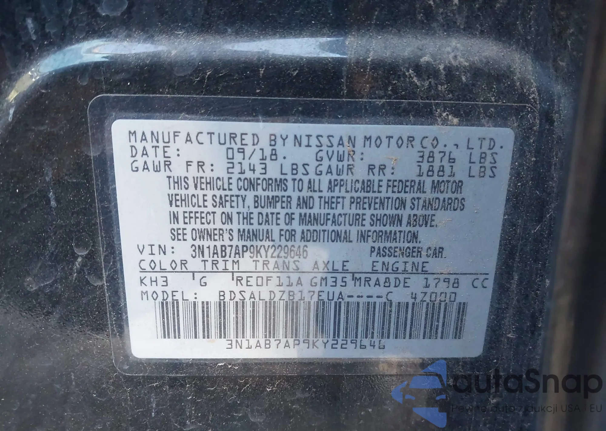 LOT: 43944146 VIN: 3N1AB7AP9KY229646