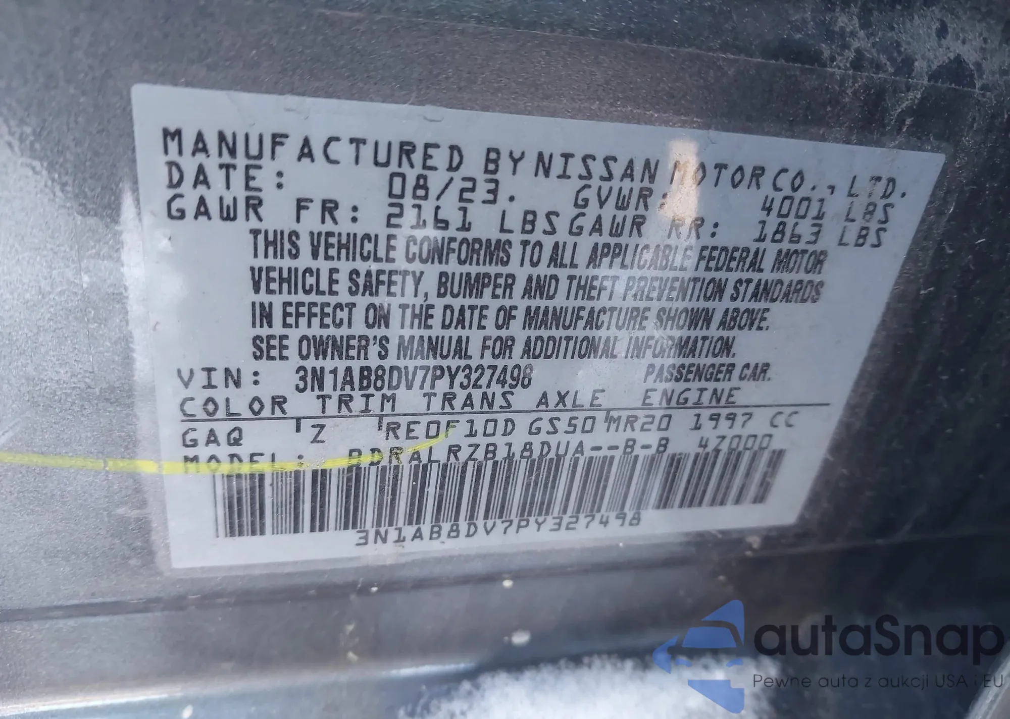 • VIN 3N1AB8DV7PY327498
