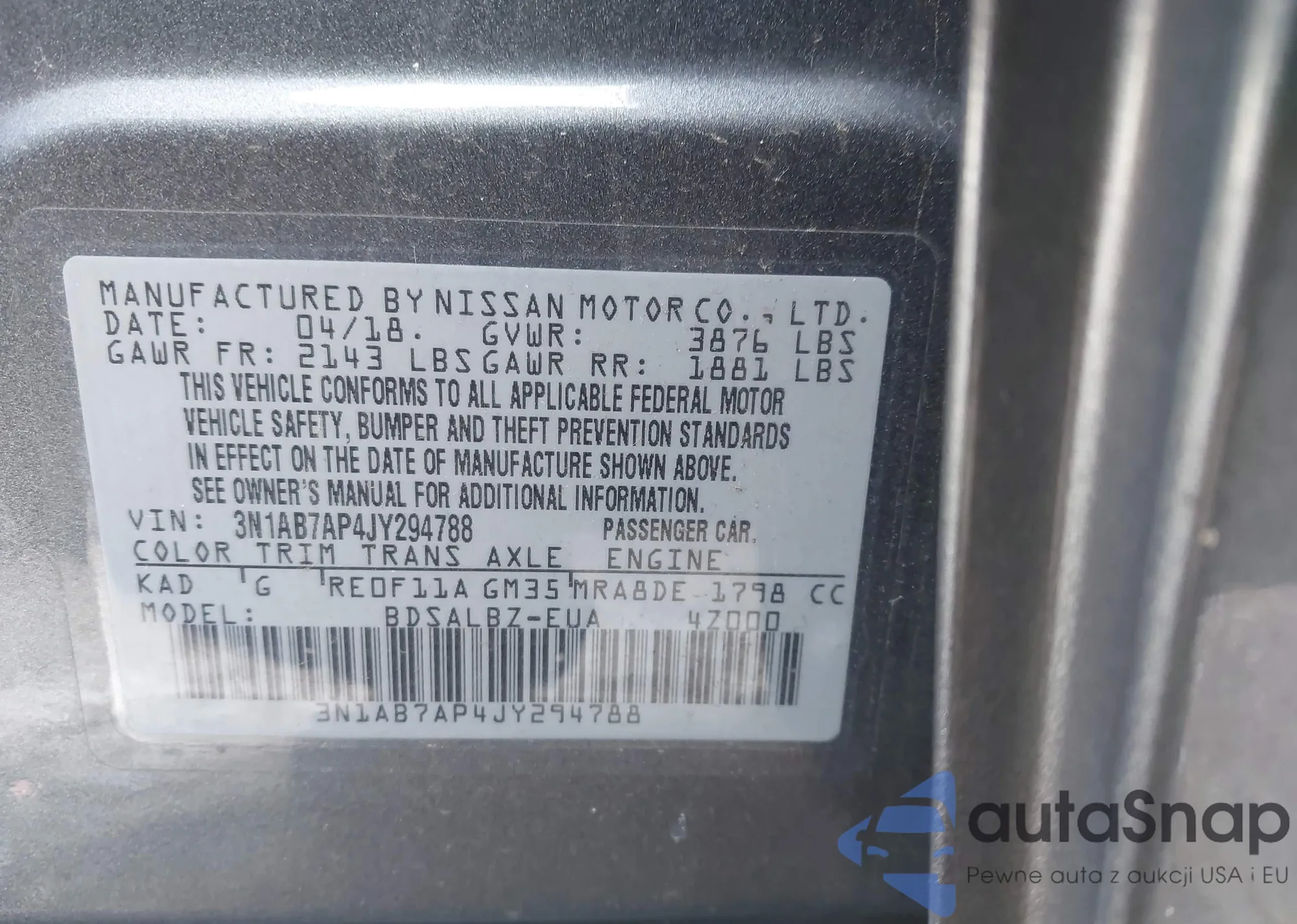 LOT: 43844950 VIN: 3N1AB7AP4JY294788