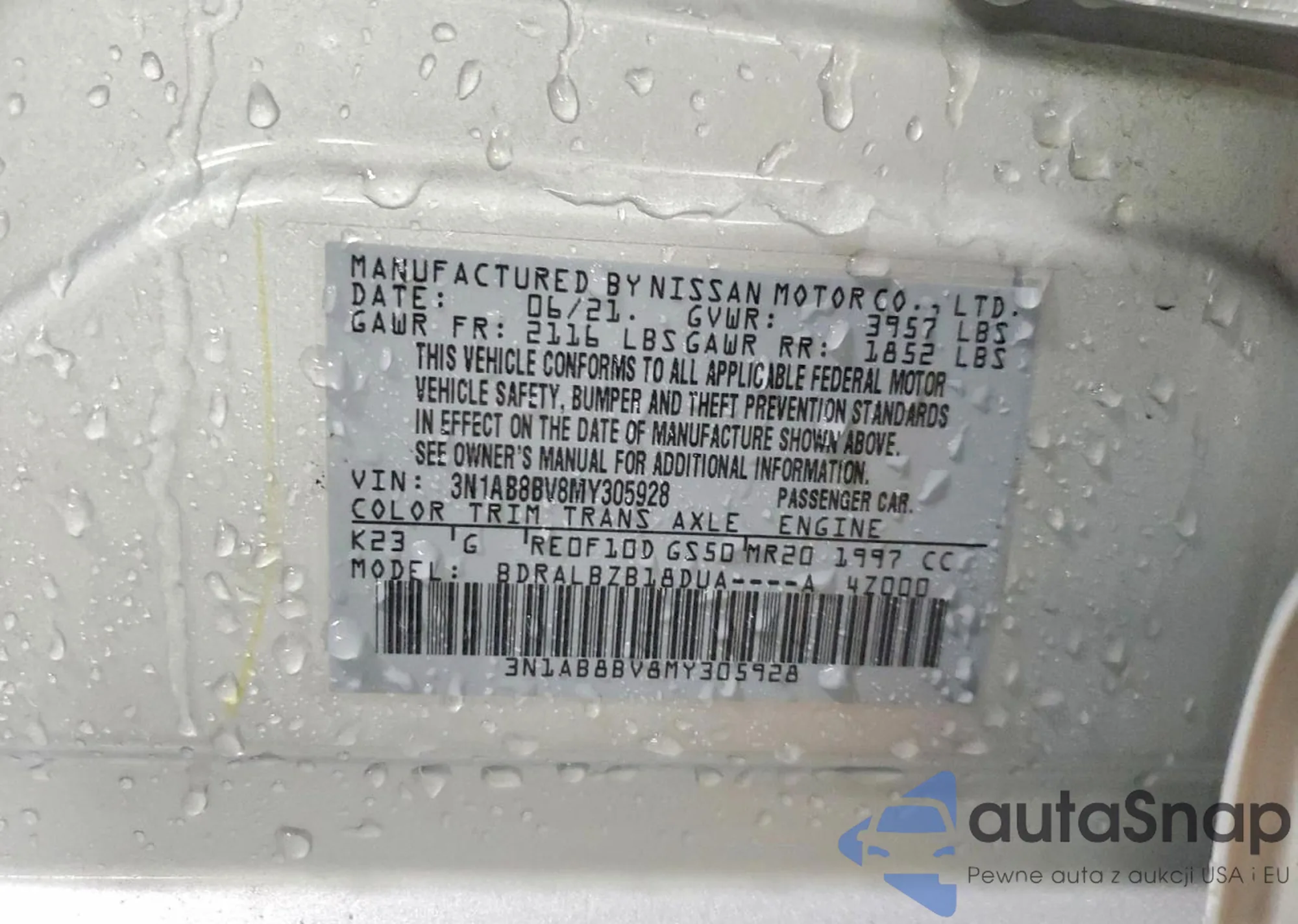 LOT: 96097275 VIN: 3N1AB8BV3MY297074