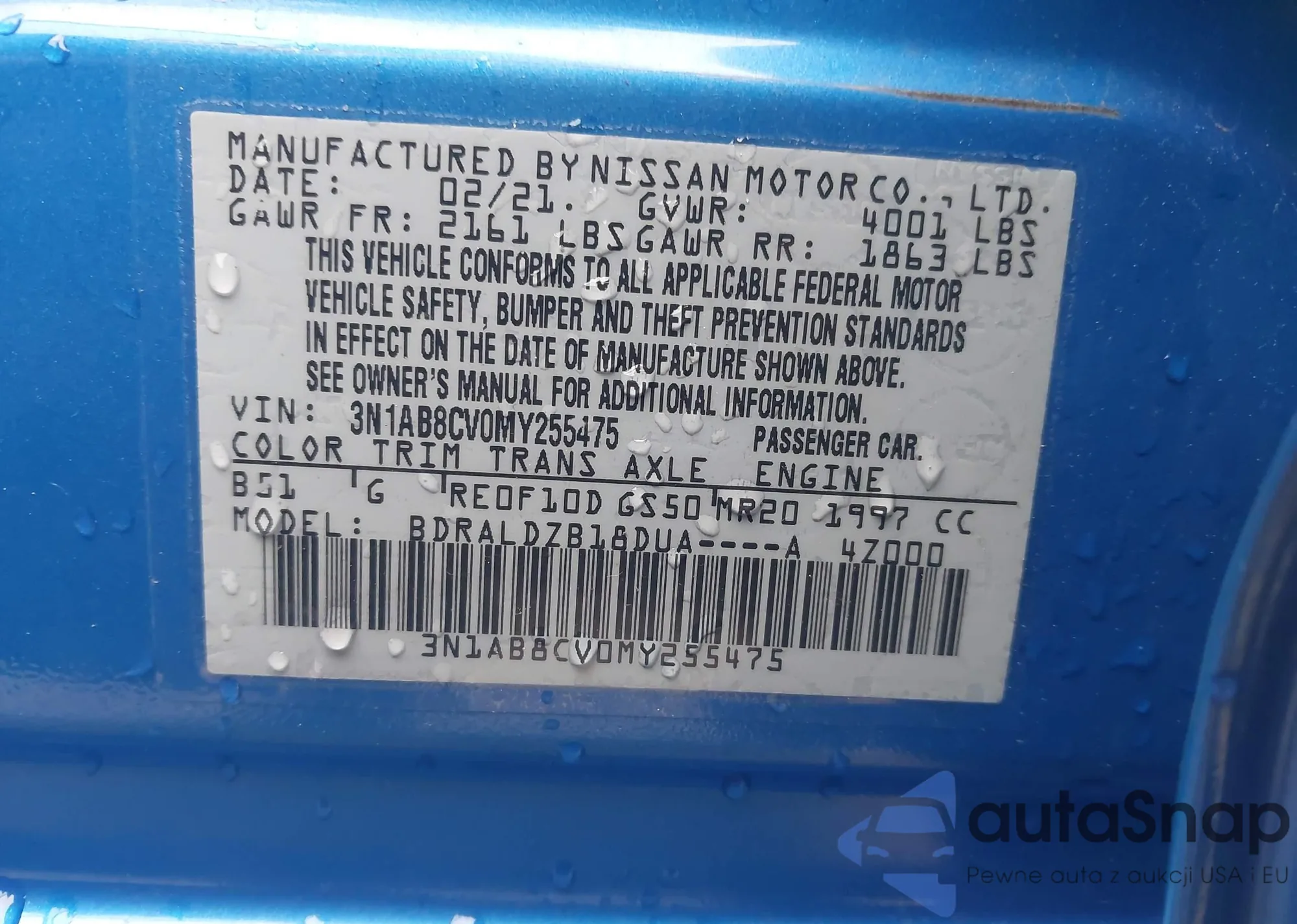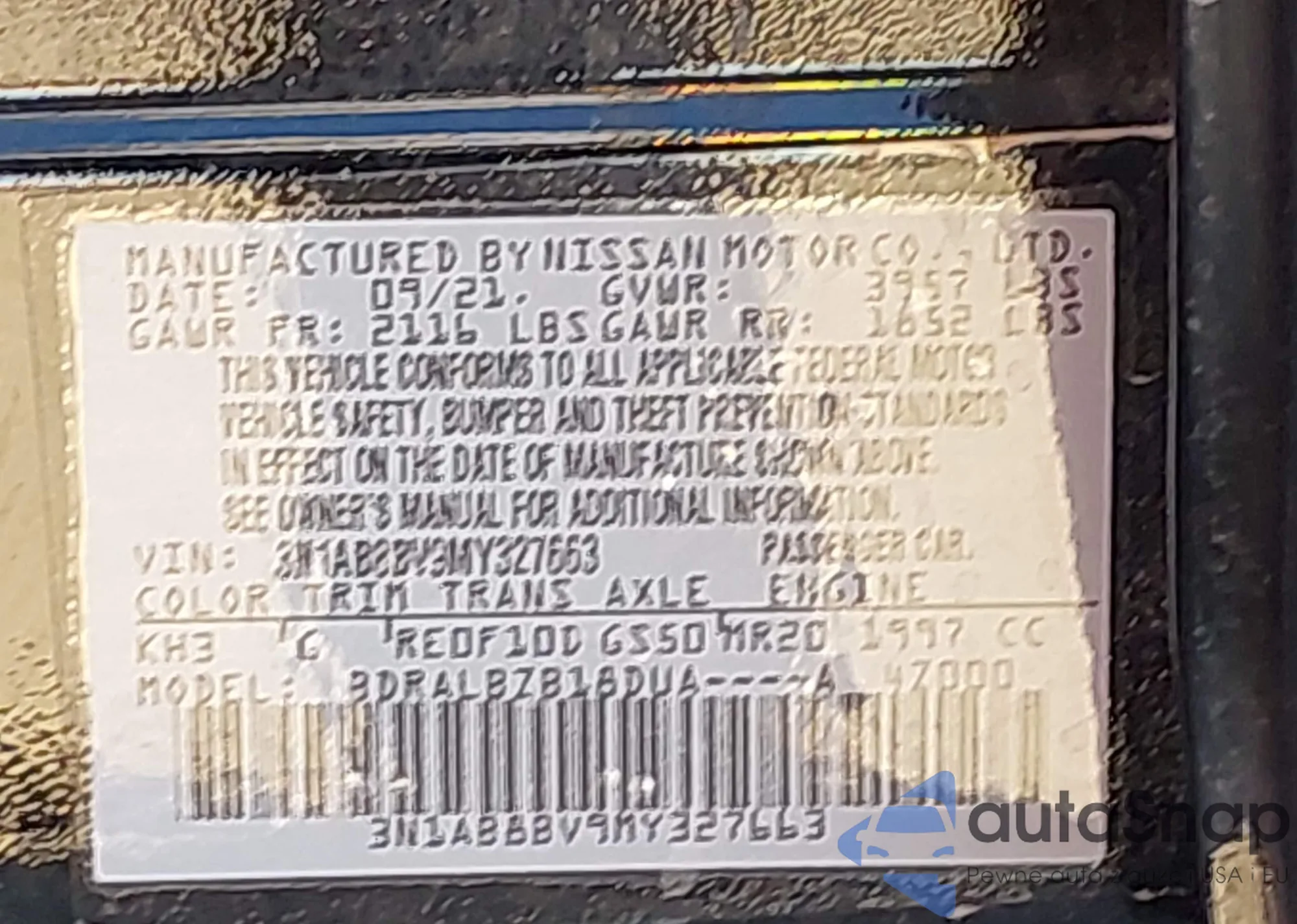 • VIN 3N1AB8BV9MY327663