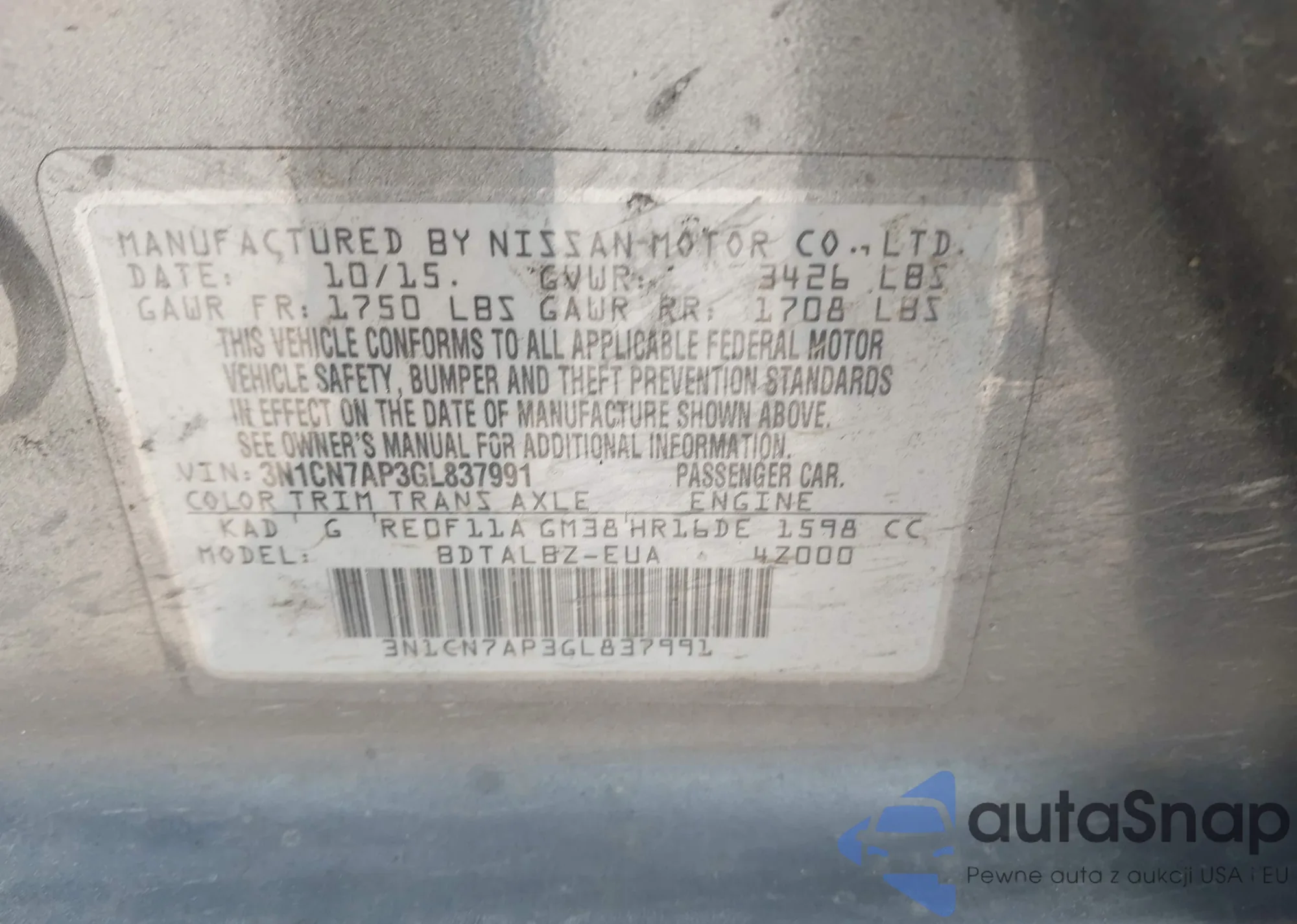 LOT: 44363542 VIN: 3N1CN7AP3GL837991