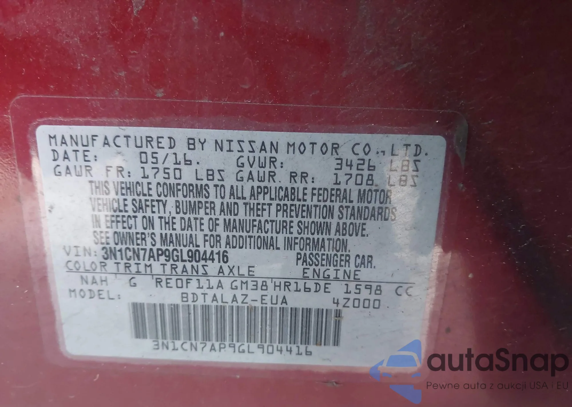 • VIN 3N1CN7AP9GL904416