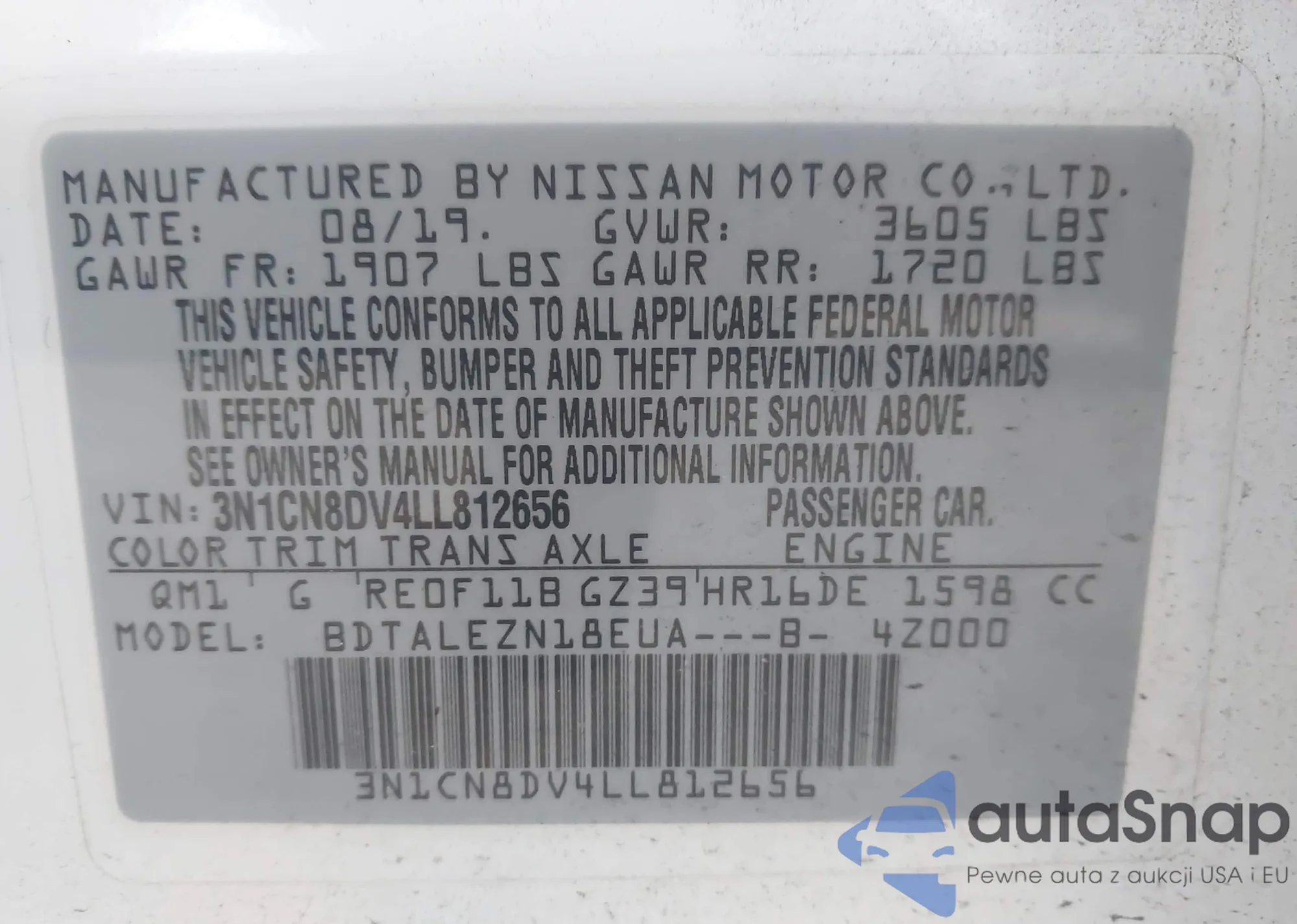 • VIN 3N1CN8DV4LL812656
