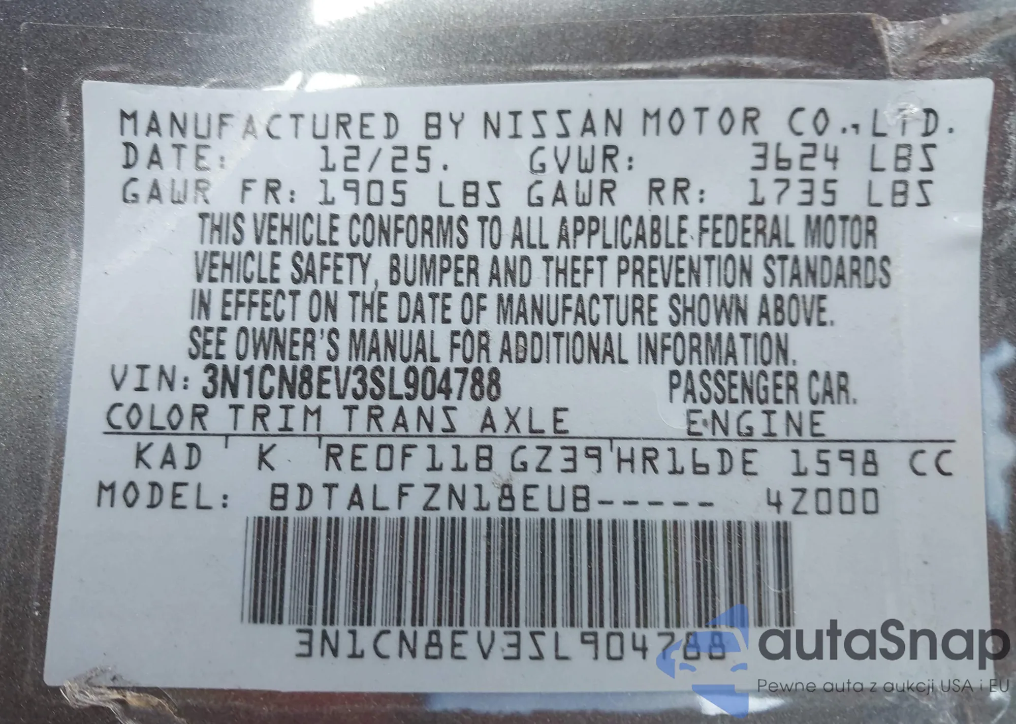 • VIN 3N1CN8EV3SL904788