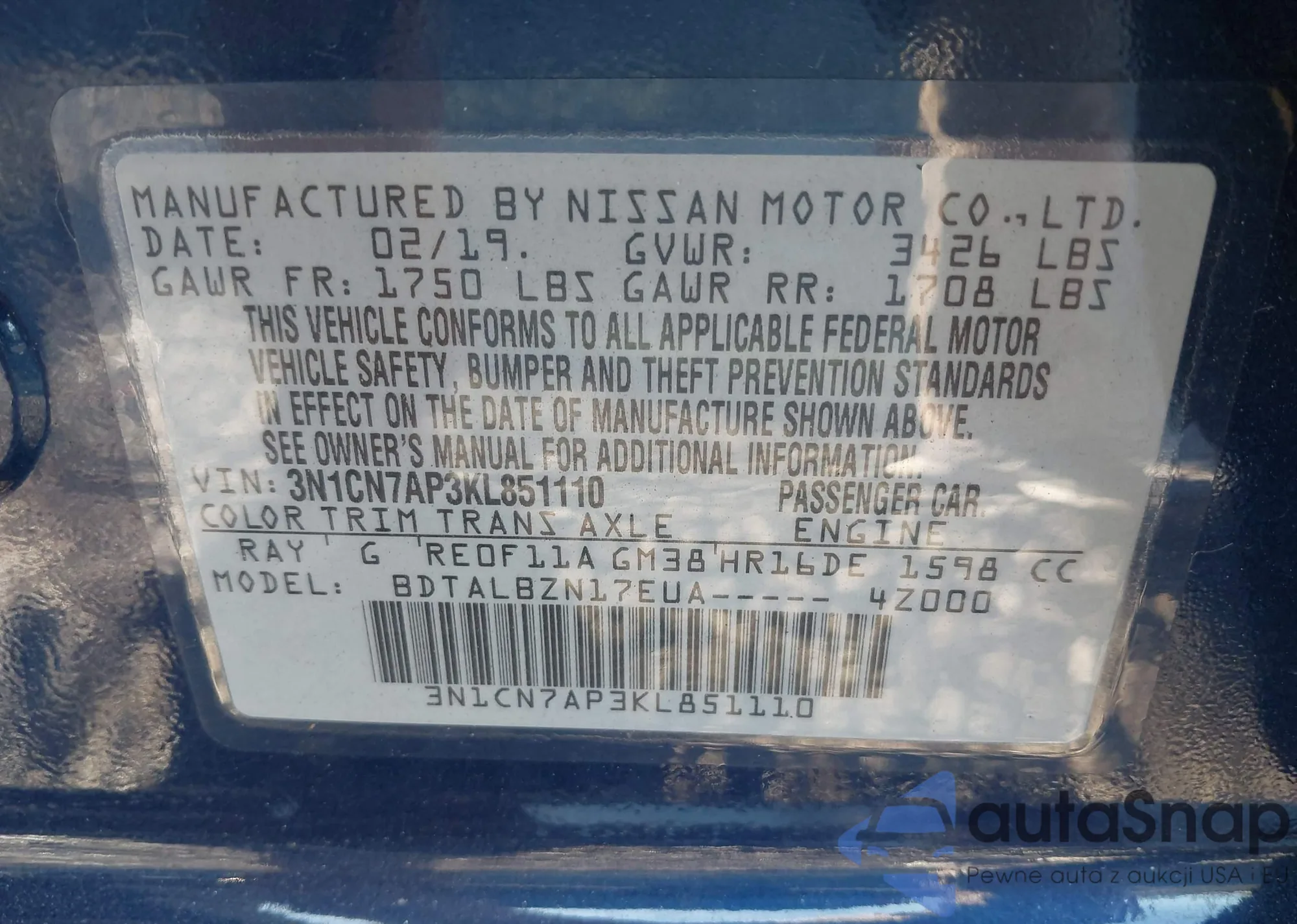 • VIN 3N1CN7AP3KL851110