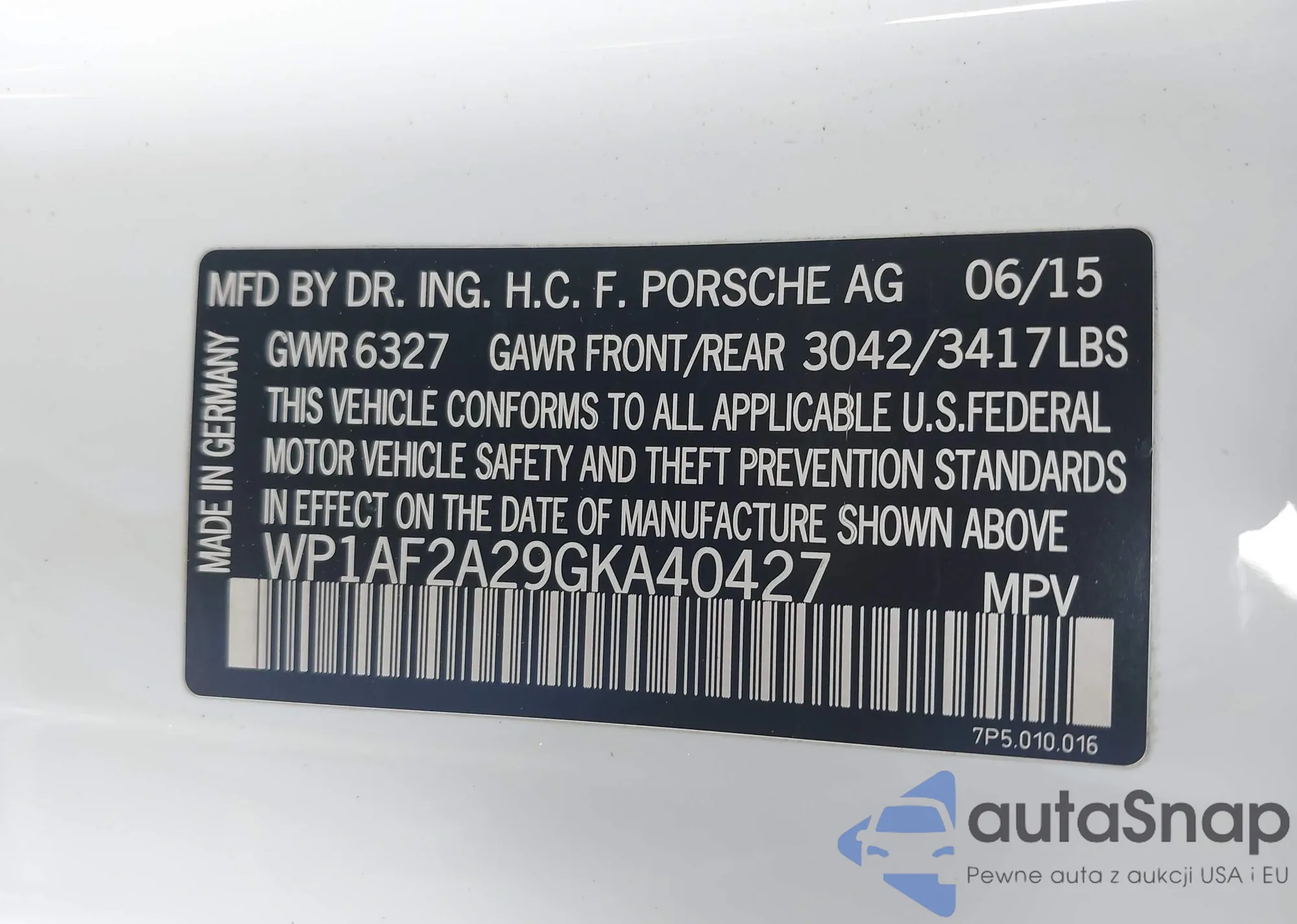 LOT: 44447556 VIN: WP1AF2A29GKA40427