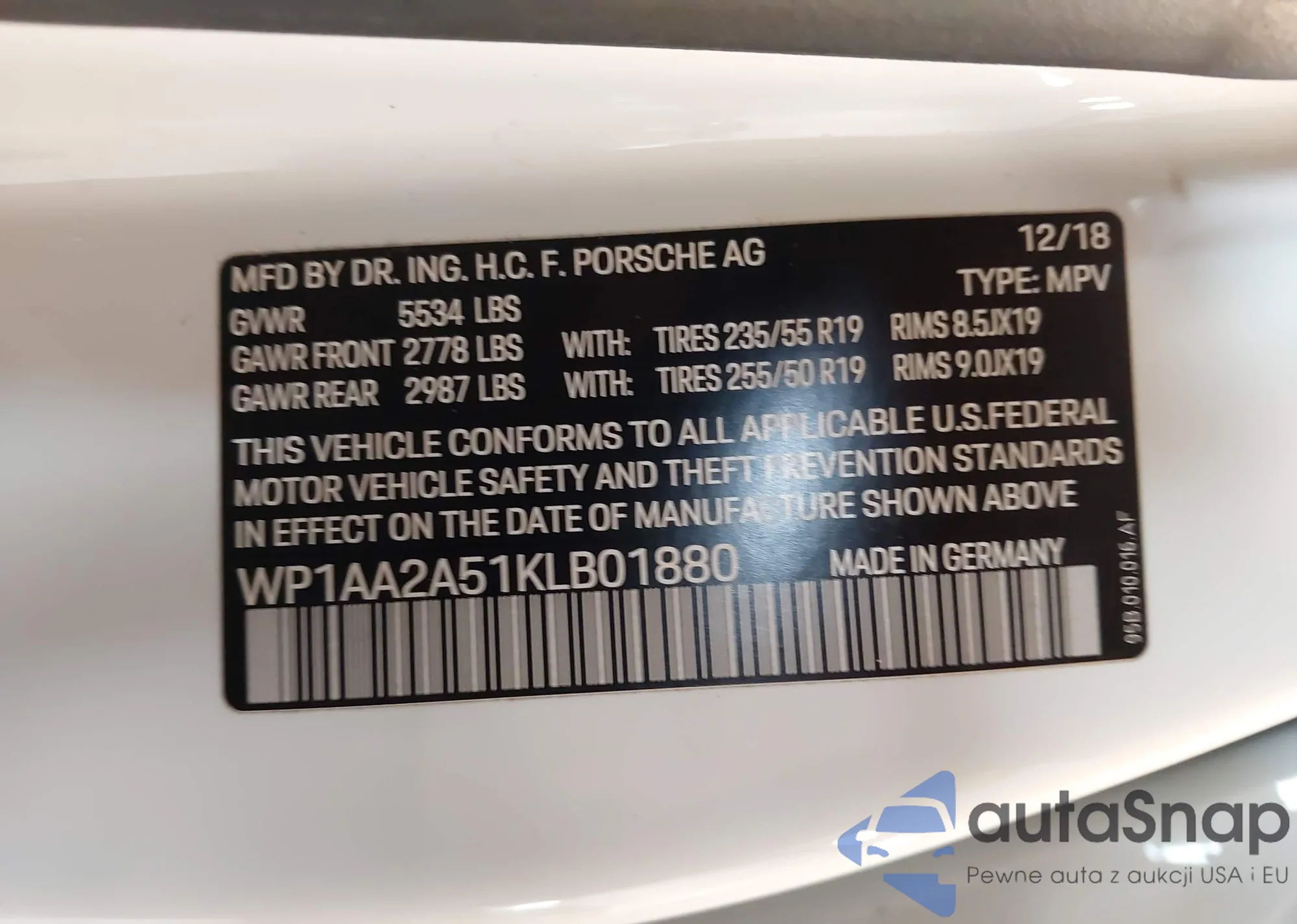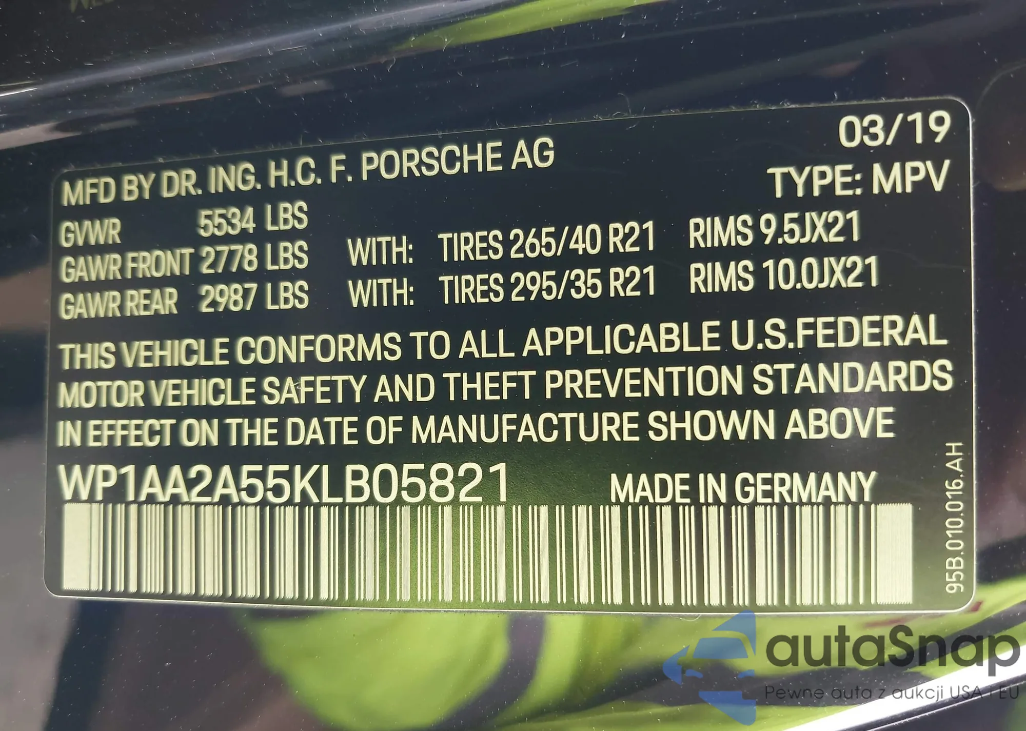 LOT: 44377929 VIN: WP1AA2A55KLB05821