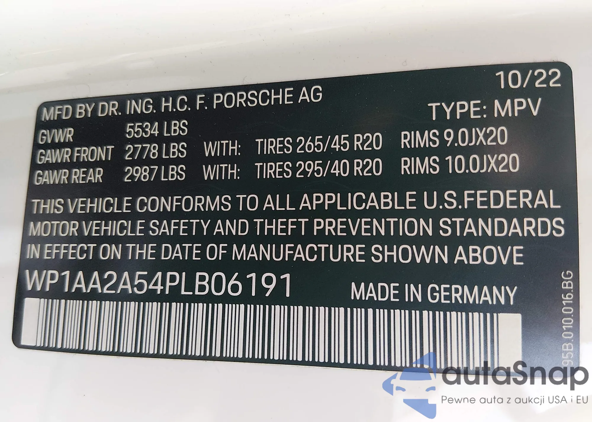 LOT: 44343869 VIN: WP1AA2A54PLB06191