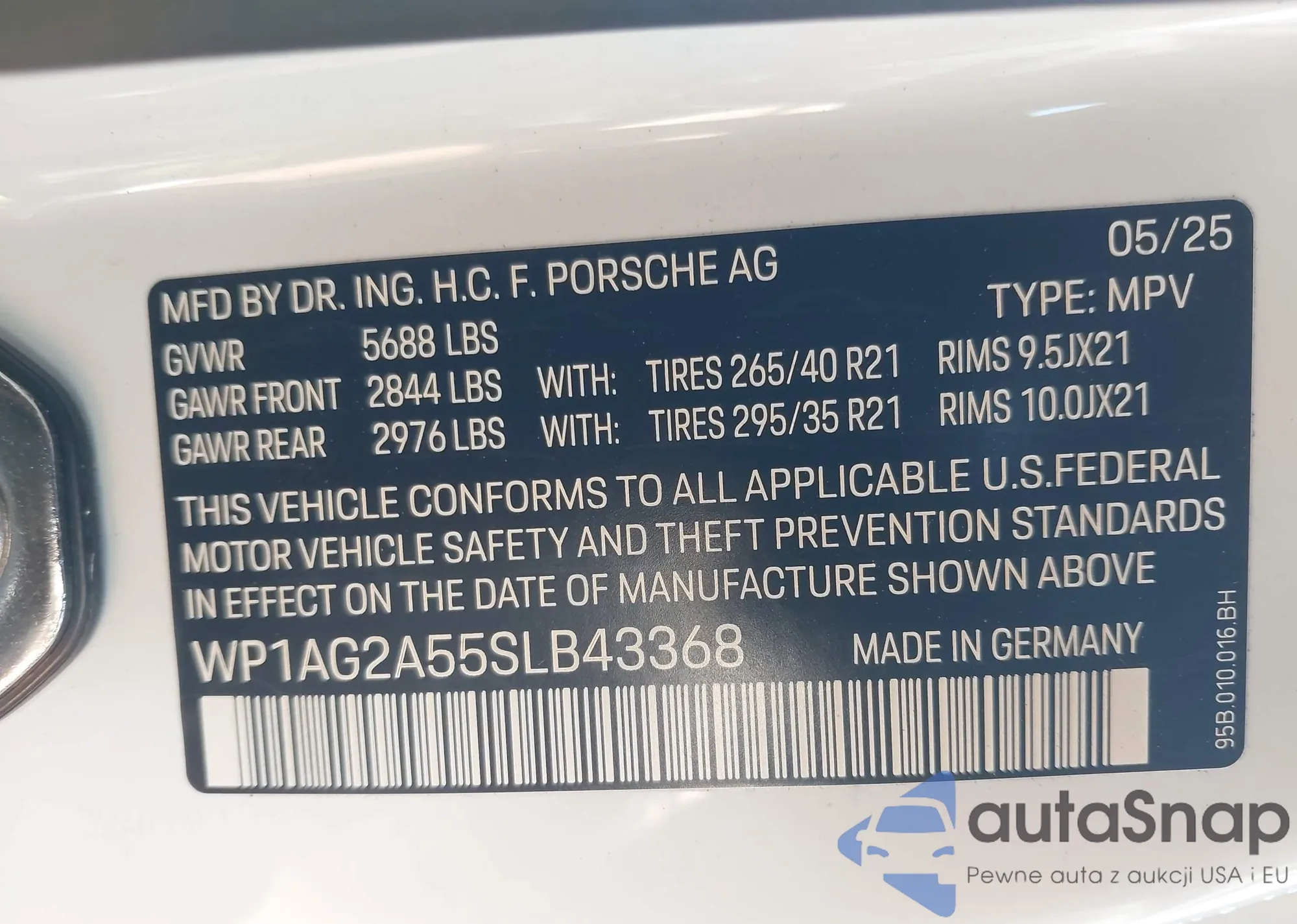 LOT: 44355291 VIN: WP1AG2A55SLB43368