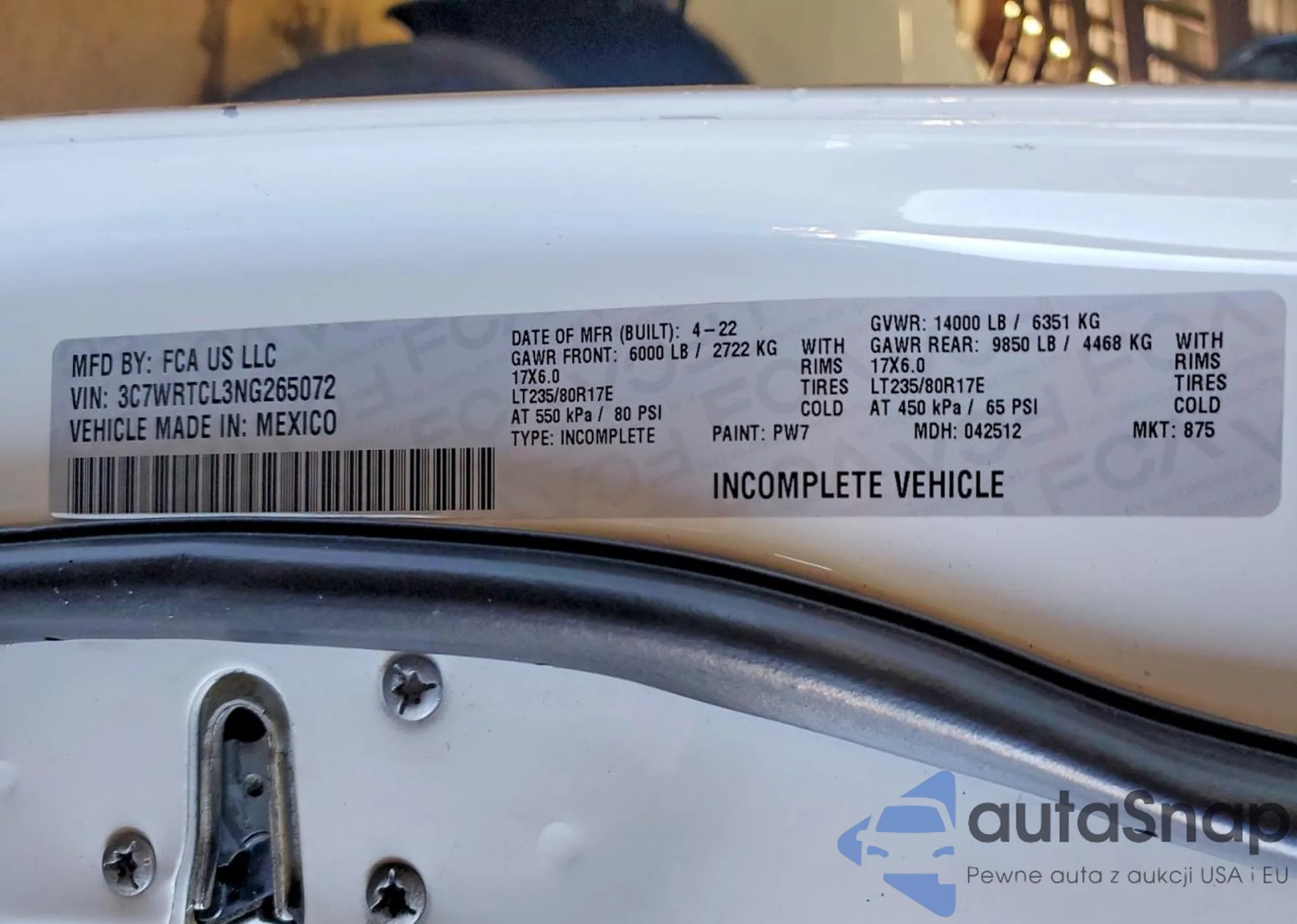 LOT: 79274155 VIN: 3C7WRTCL3NG265072