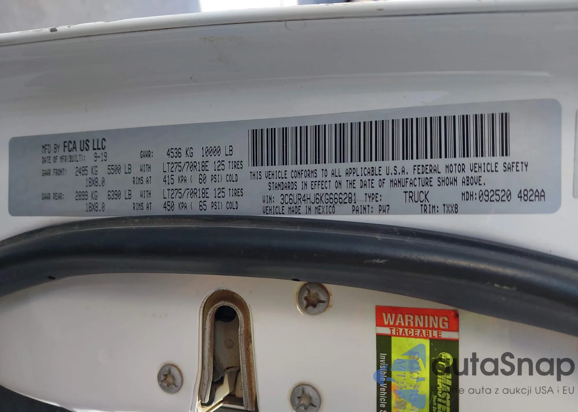 • VIN 3C6UR4HJ6KG666281