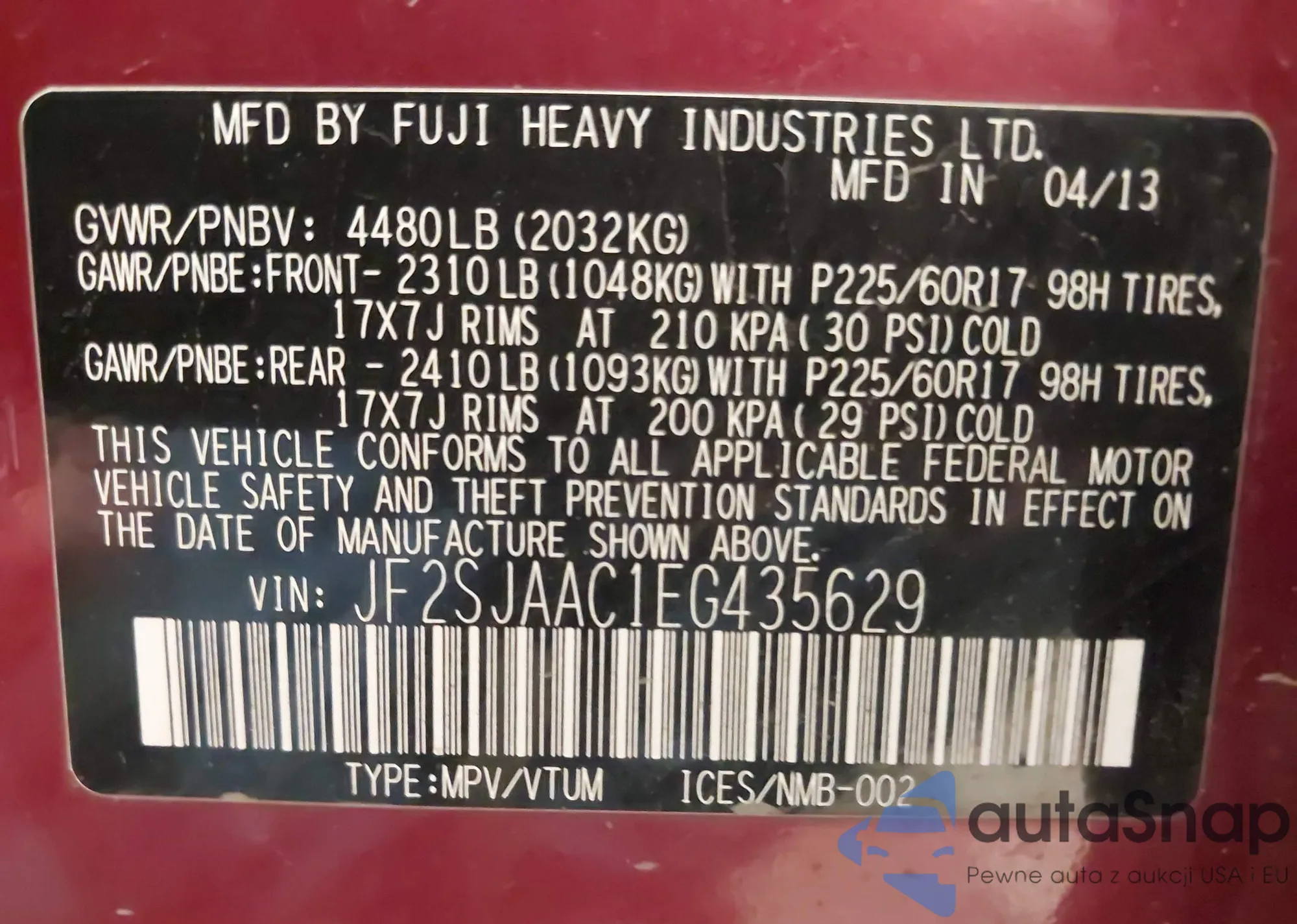 • VIN JF2SJAAC1EG435629