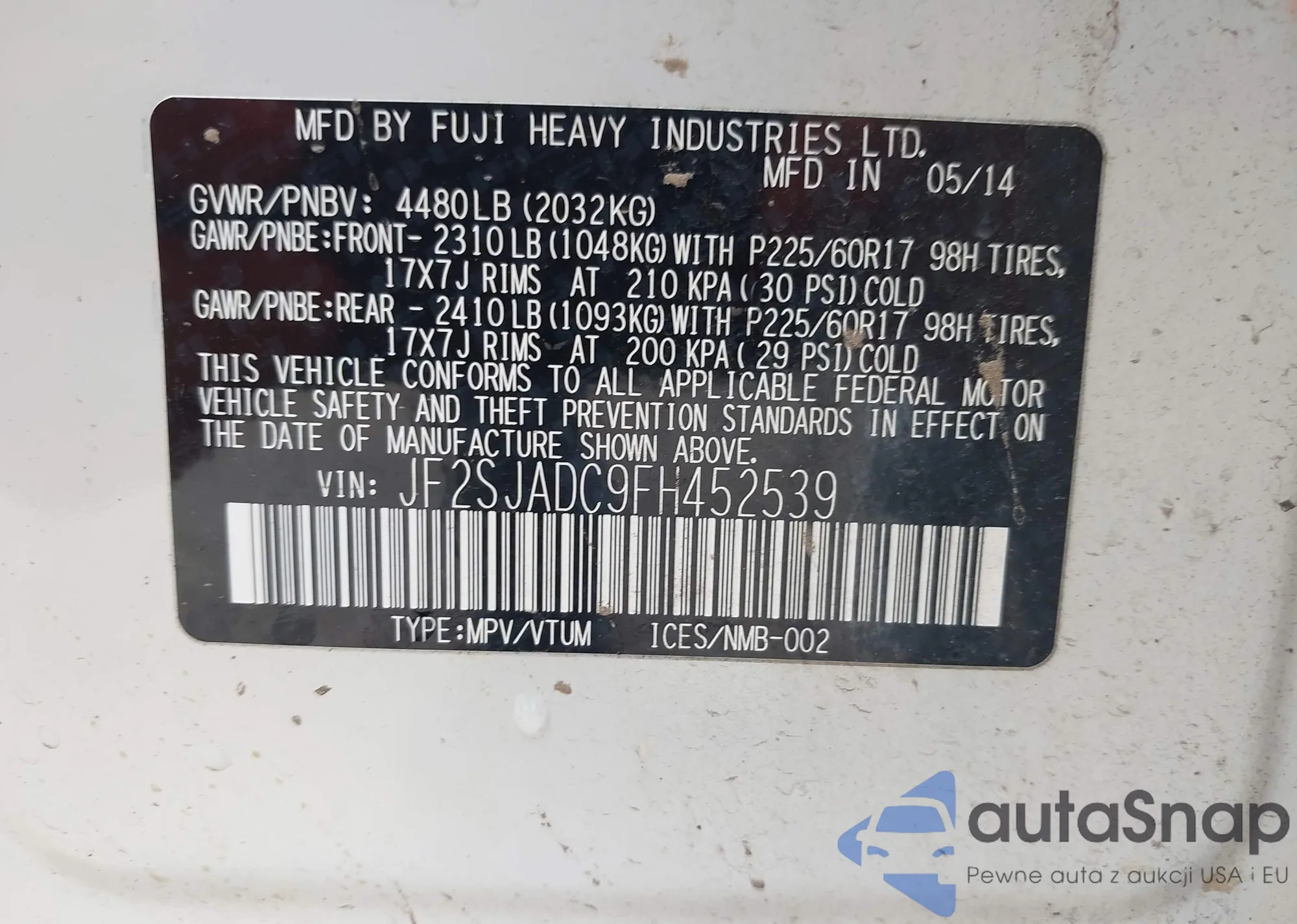 • VIN JF2SJADC9FH452539