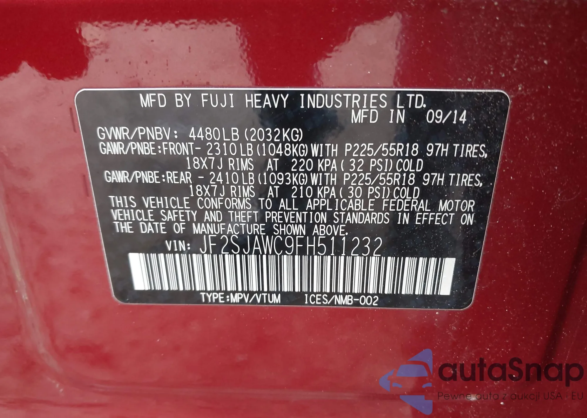 • VIN JF2SJAWC9FH511232