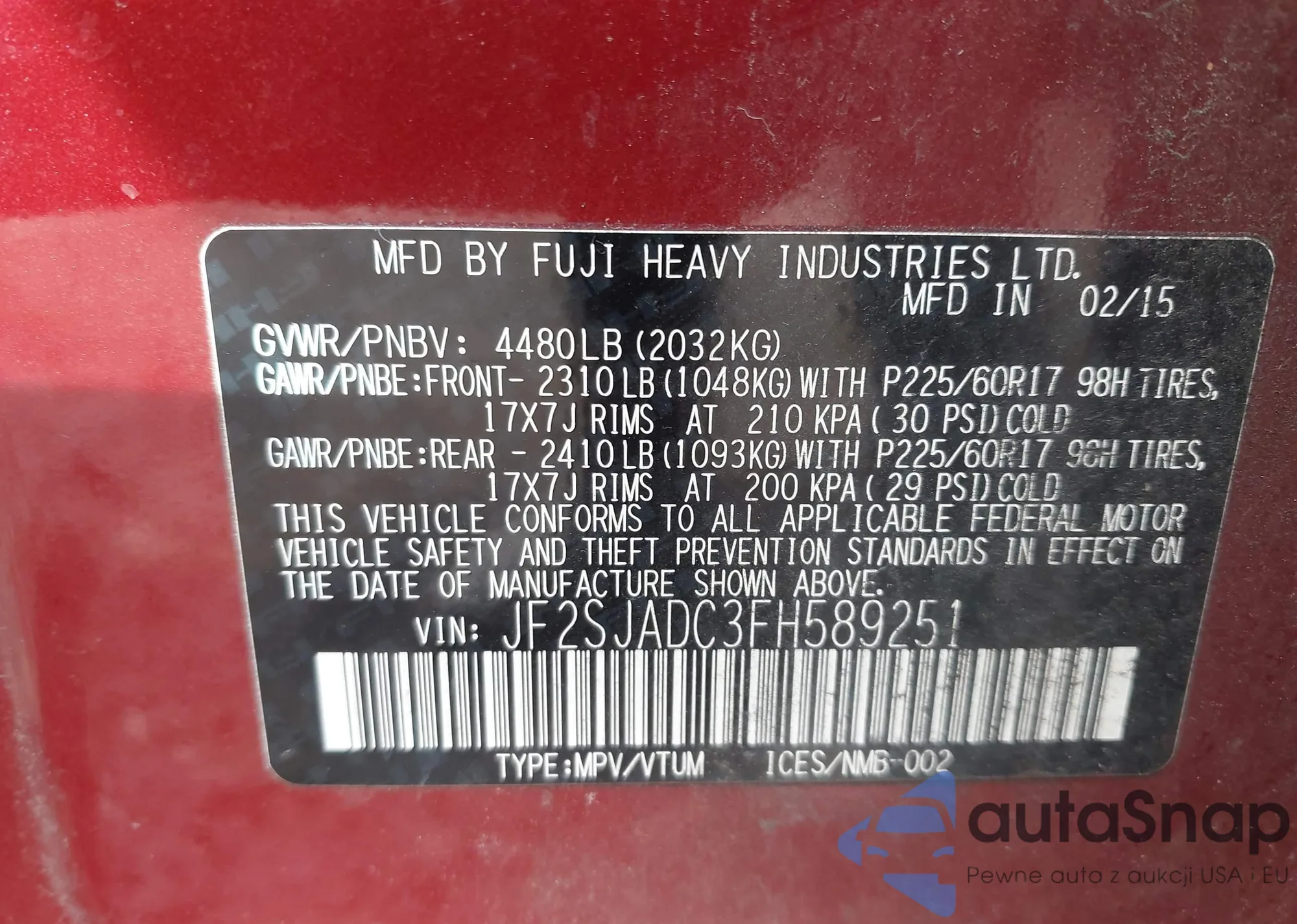 LOT: 39057222 VIN: JF2SJADC8FH800959