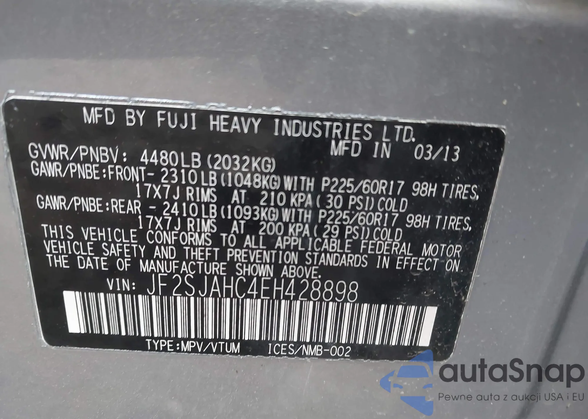 • VIN JF2SJAHC4EH428898