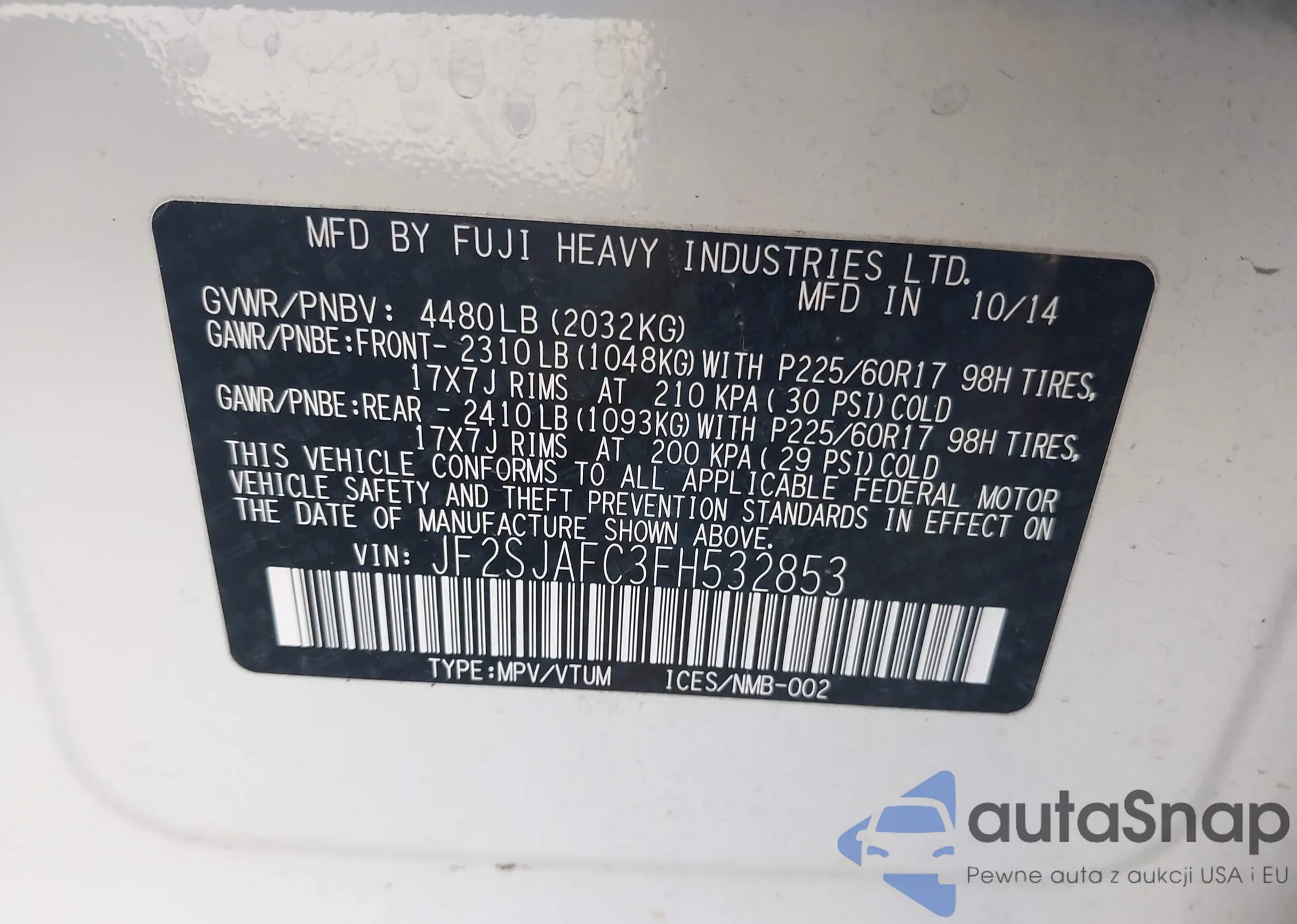 LOT: 44510200 VIN: JF2SJAFC3FH532853