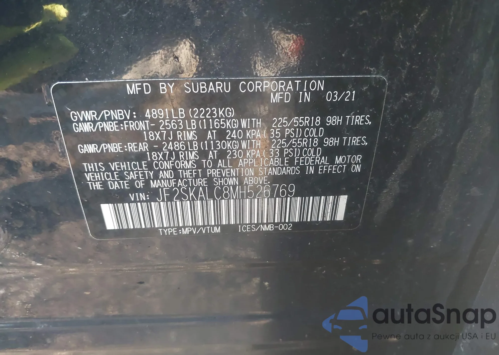 LOT: 44345418 VIN: JF2SKAUC0MH504456