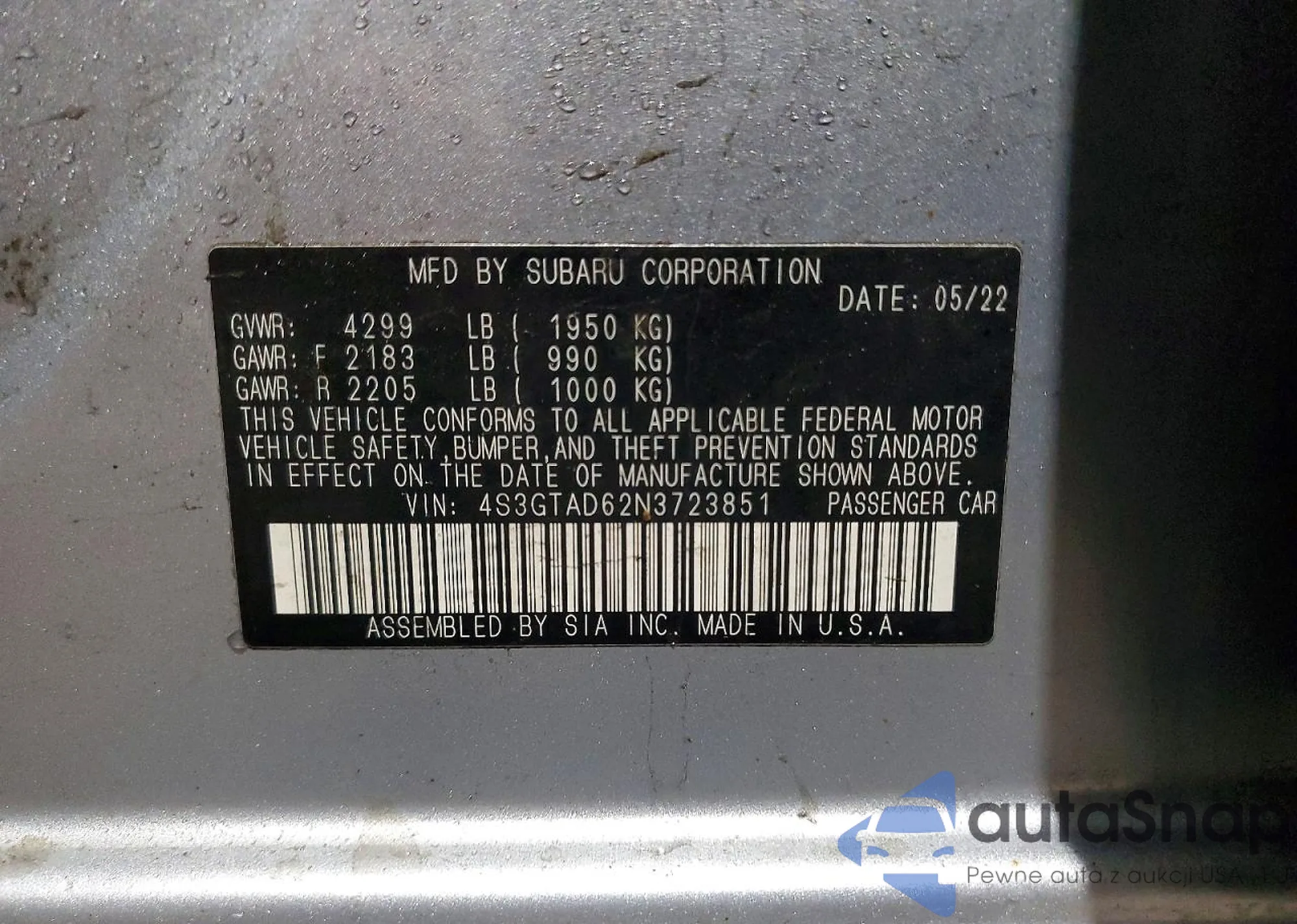 • VIN 4S3GTAD62N3723851