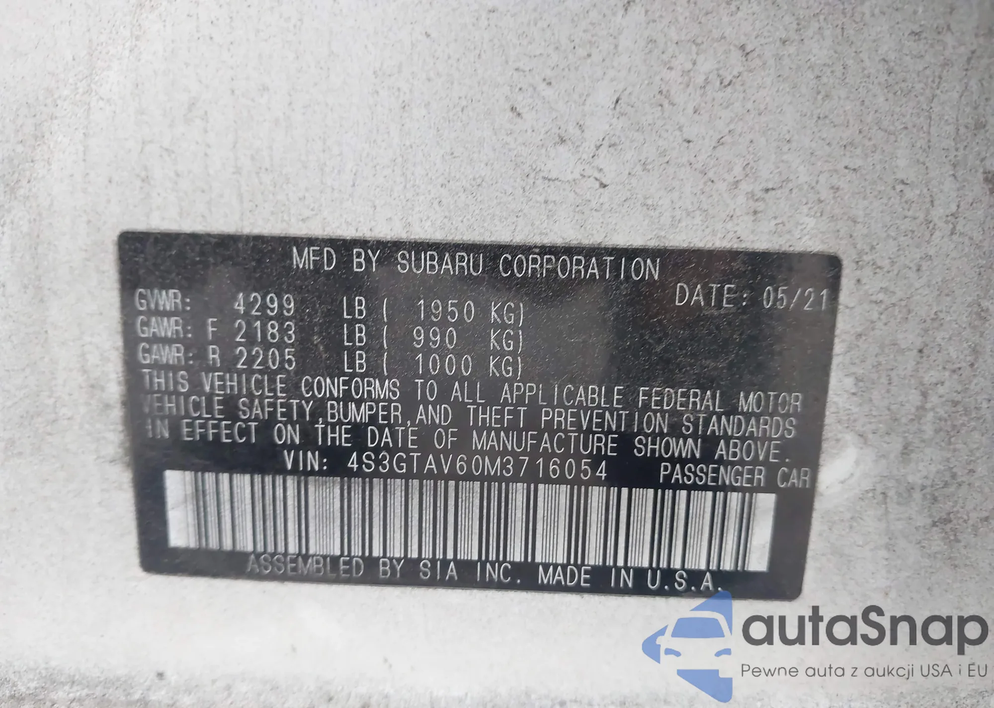 • VIN 4S3GTAV60M3716054