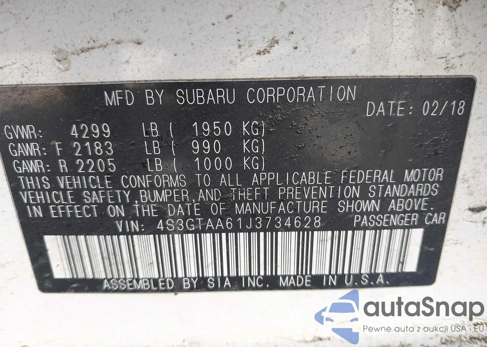 • VIN 4S3GTAA61J3734628