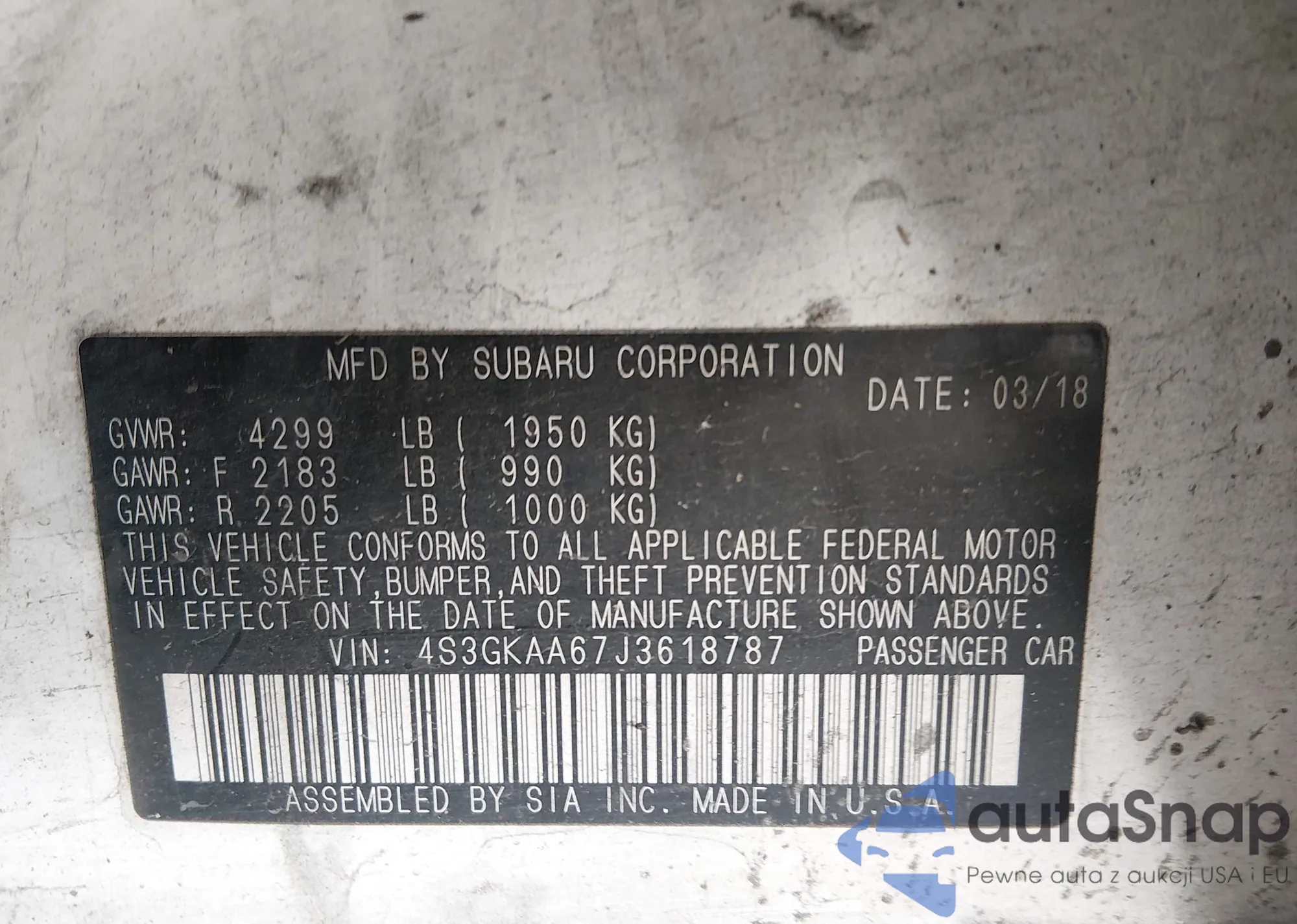 • VIN 4S3GKAA67J3618787