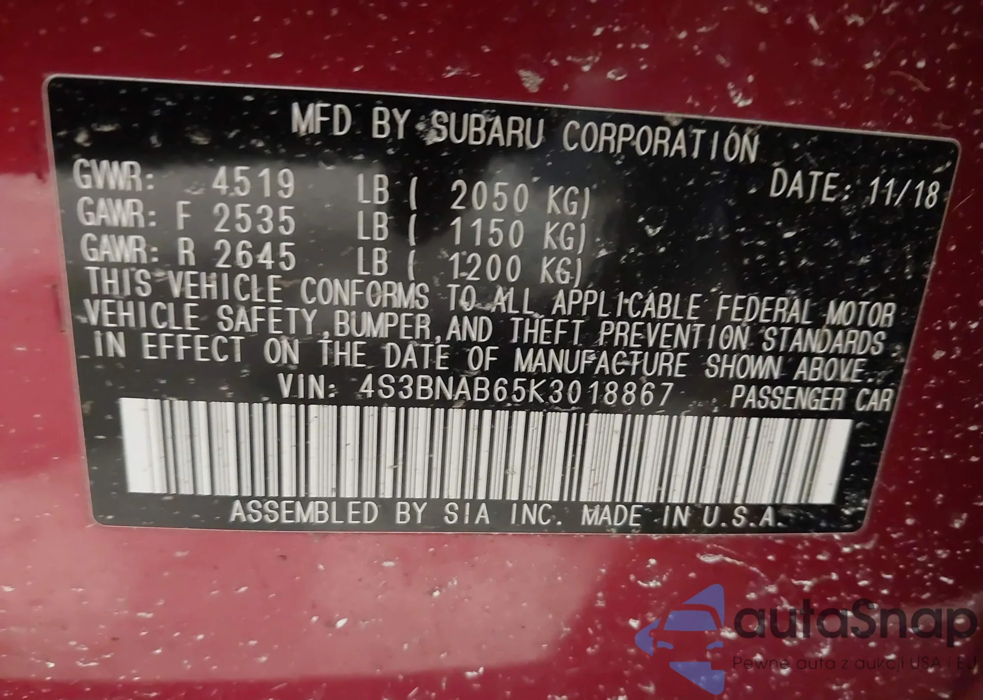 • VIN 4S3BNAB65K3018867