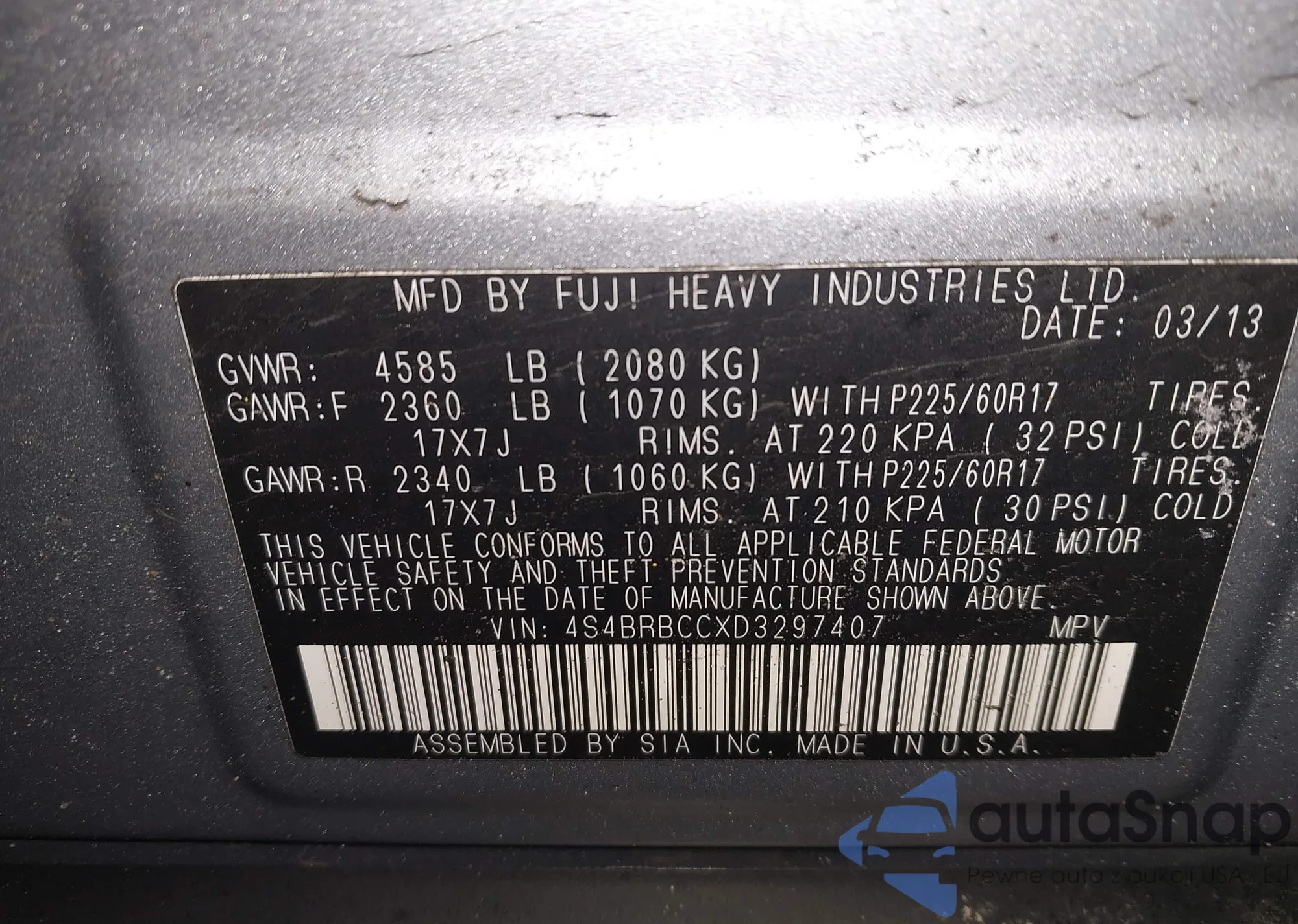 LOT: 44439496 VIN: 4S4BRBPC3D3216662